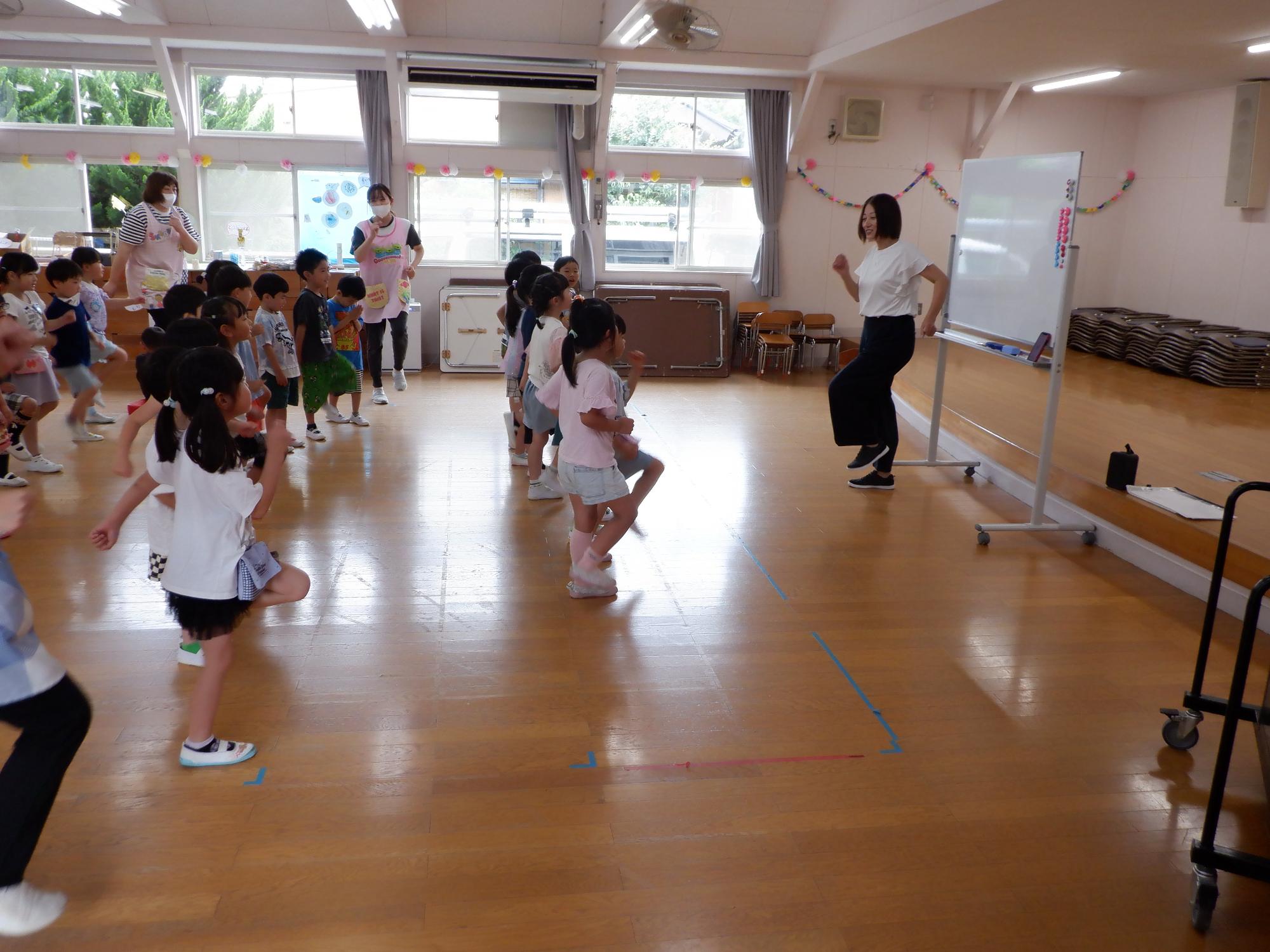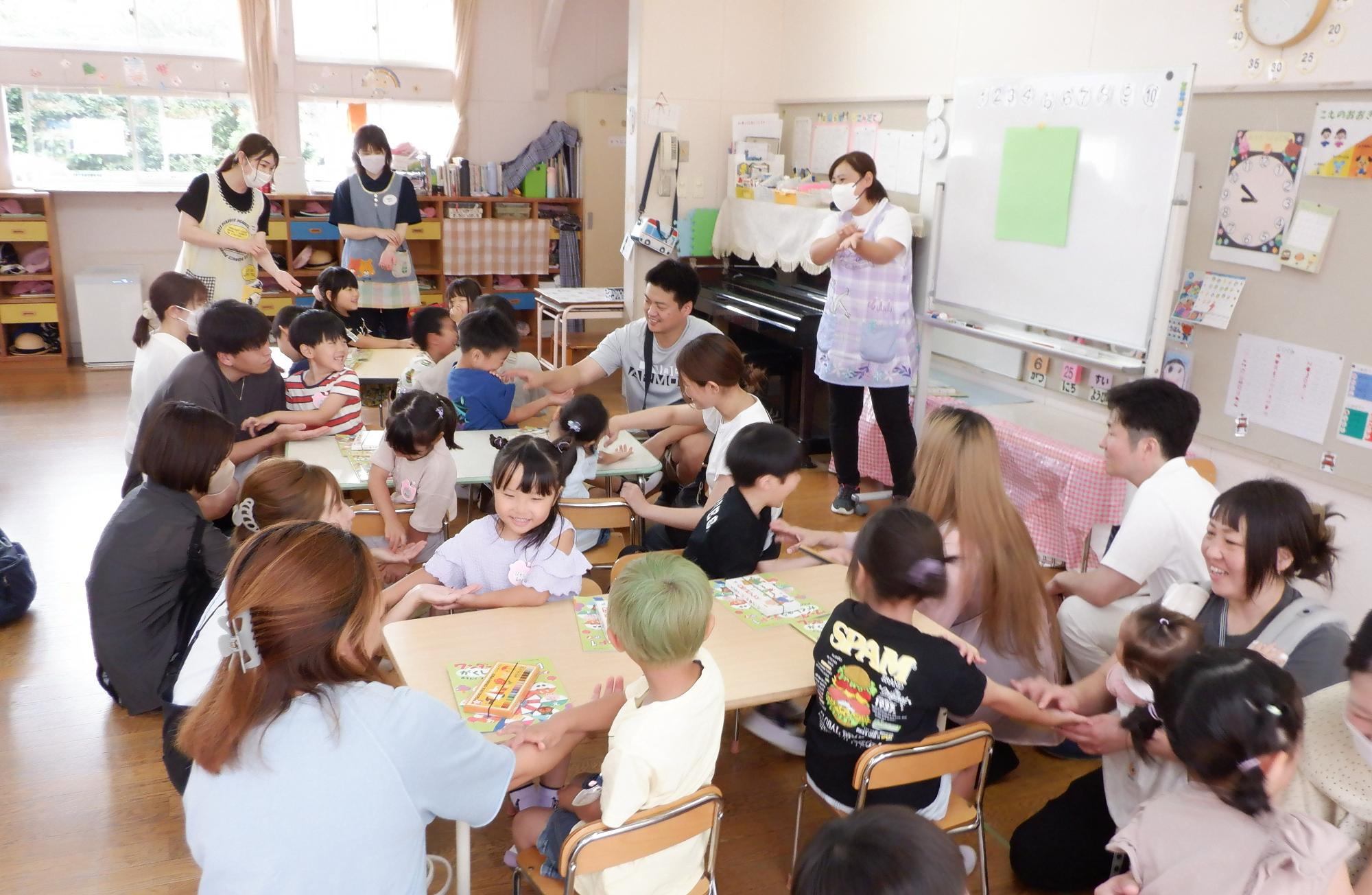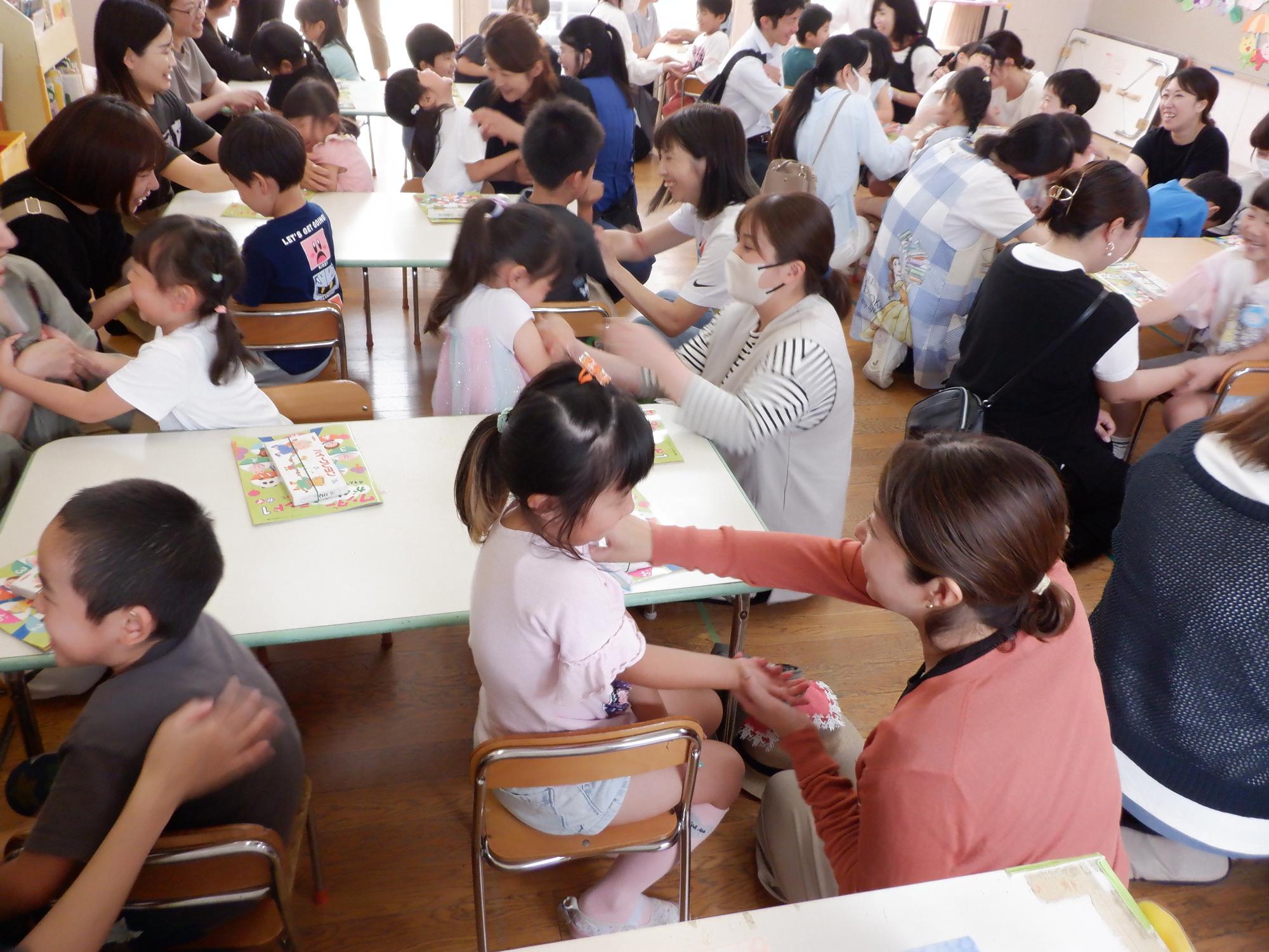 6月25日(水曜日)1学期末保護者会を行いました。そら組、にじ組クラス毎に2時間、子ども達の園での生活や学びの様子を保護者の皆様に見ていただきました。1時間は外部講師による英語教室、もう1時間は学習と親子ふれあい活動を行いました。親子一緒の活動では子ども達の笑顔がたくさん見られました。