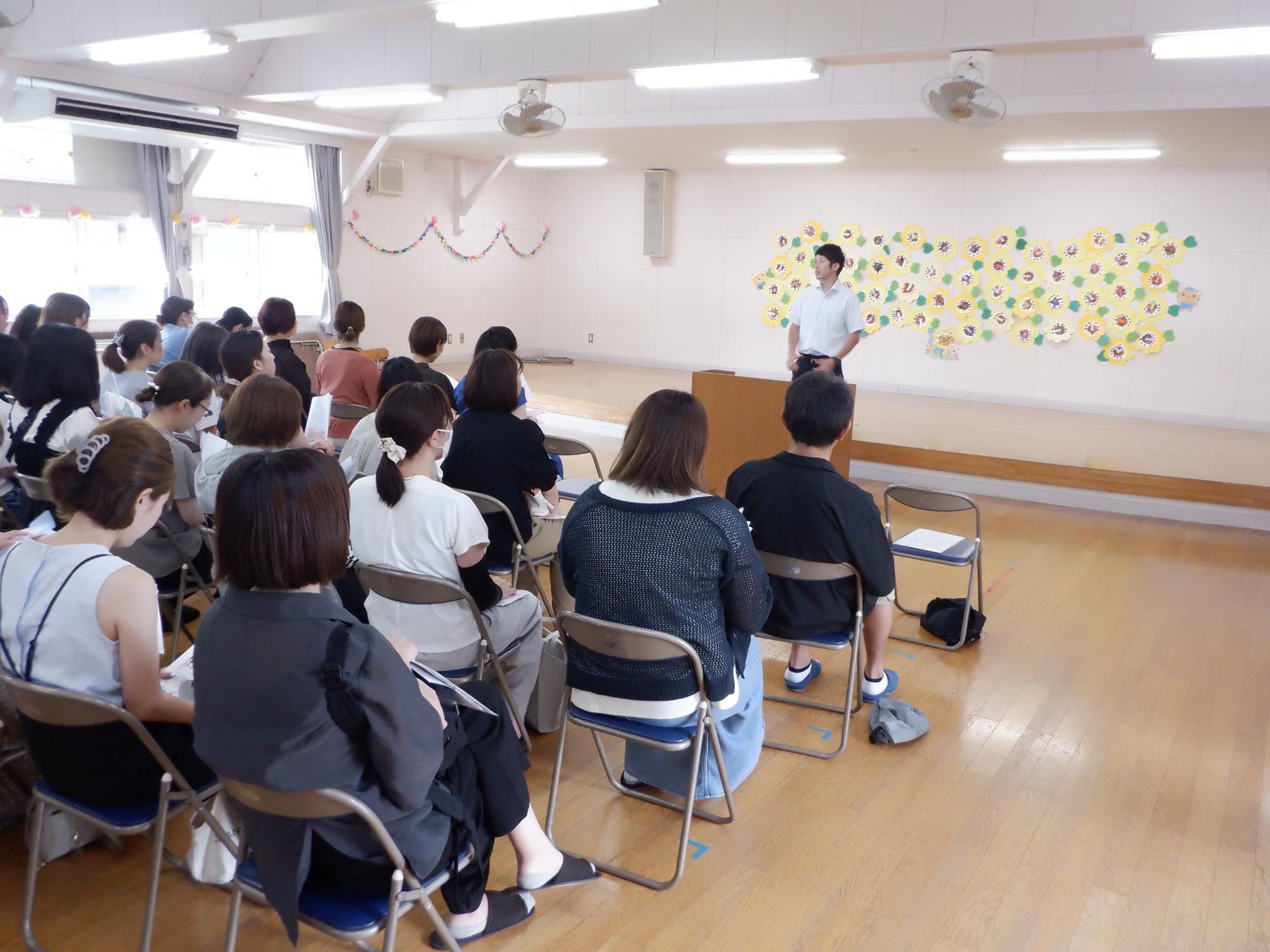 最後に全体会を開き、保護者会長からご挨拶をいただきました。その後、職員から1学期の子どもたちの様子を話したり、夏休みの預かりについて説明したりしました。