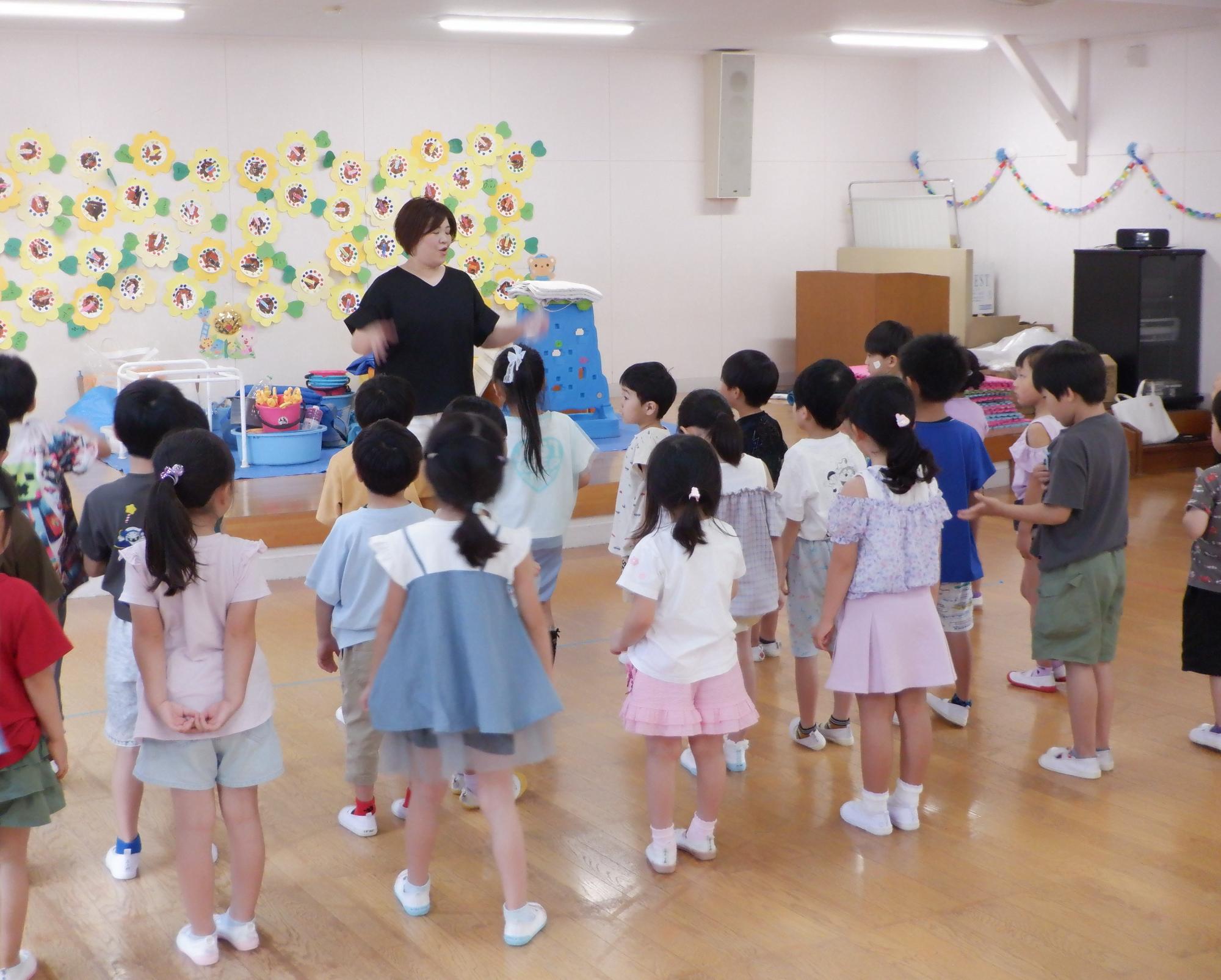 7月10日(木曜日)音楽教室を行いました。講師は西下里奈先生です。西下先生のピアノの音色やリズムに合わせて体を動かしました。音をよく聴いて、早く動いたり遅く動いたり、大きく伸びたり、小さく身を縮めたりしました。タンバリンを持ちながらのリズム打ちやリズムに合わせてのボール回しを行いました、最初は難しかったですが、上手に合わせて動くことができました。「音楽は楽しい」ことを実感した子ども達でした。