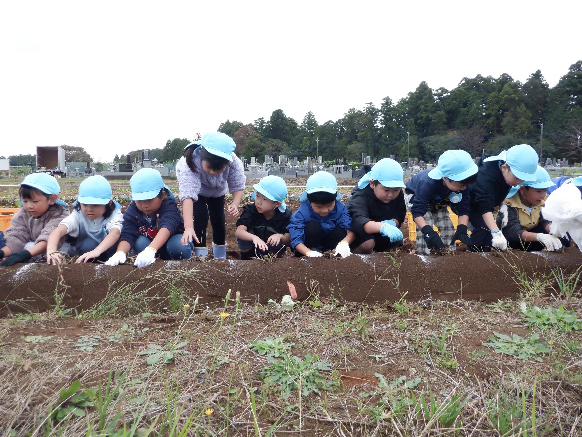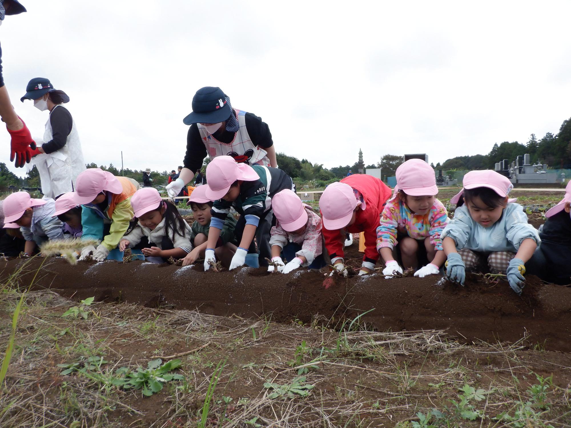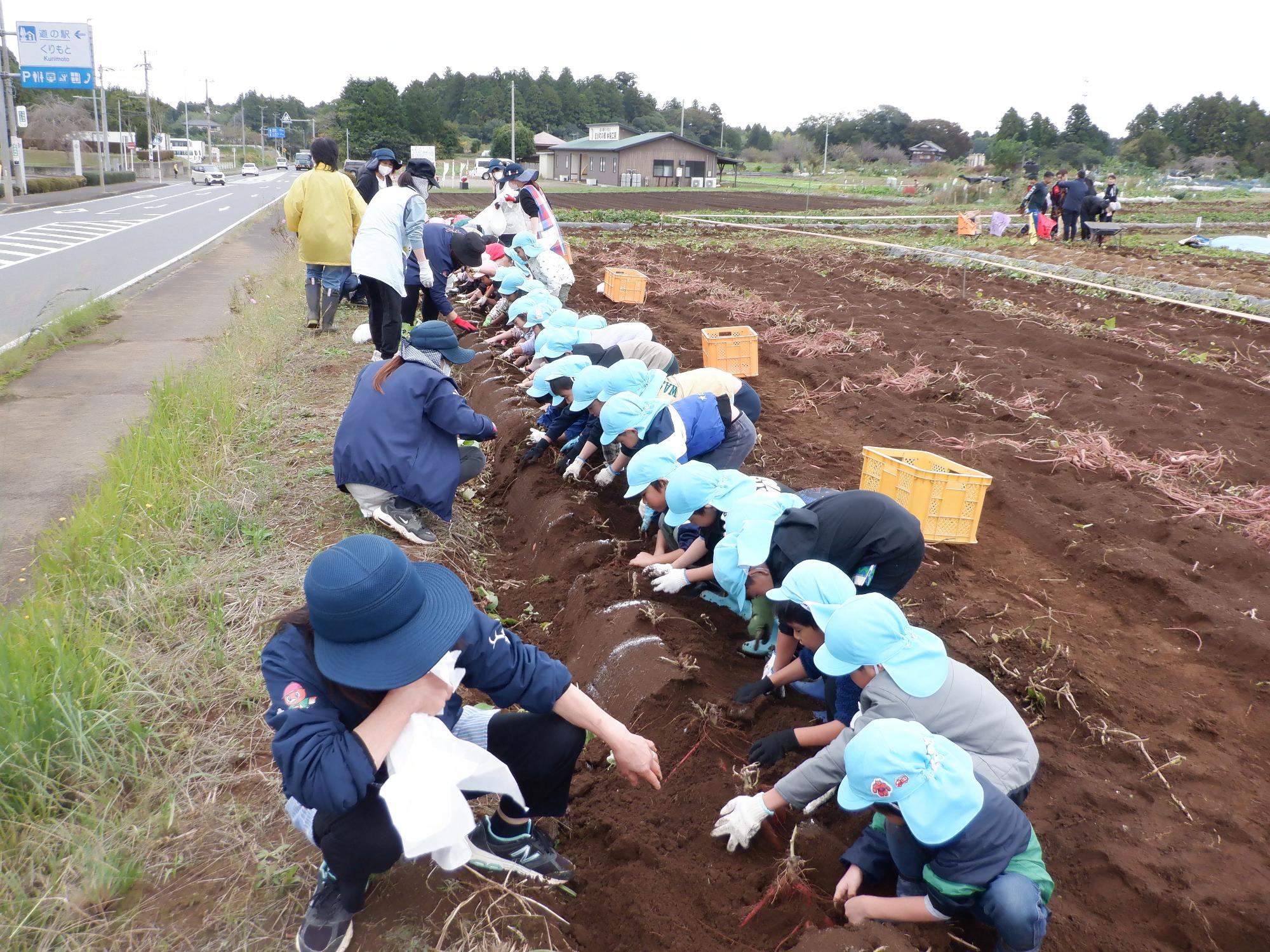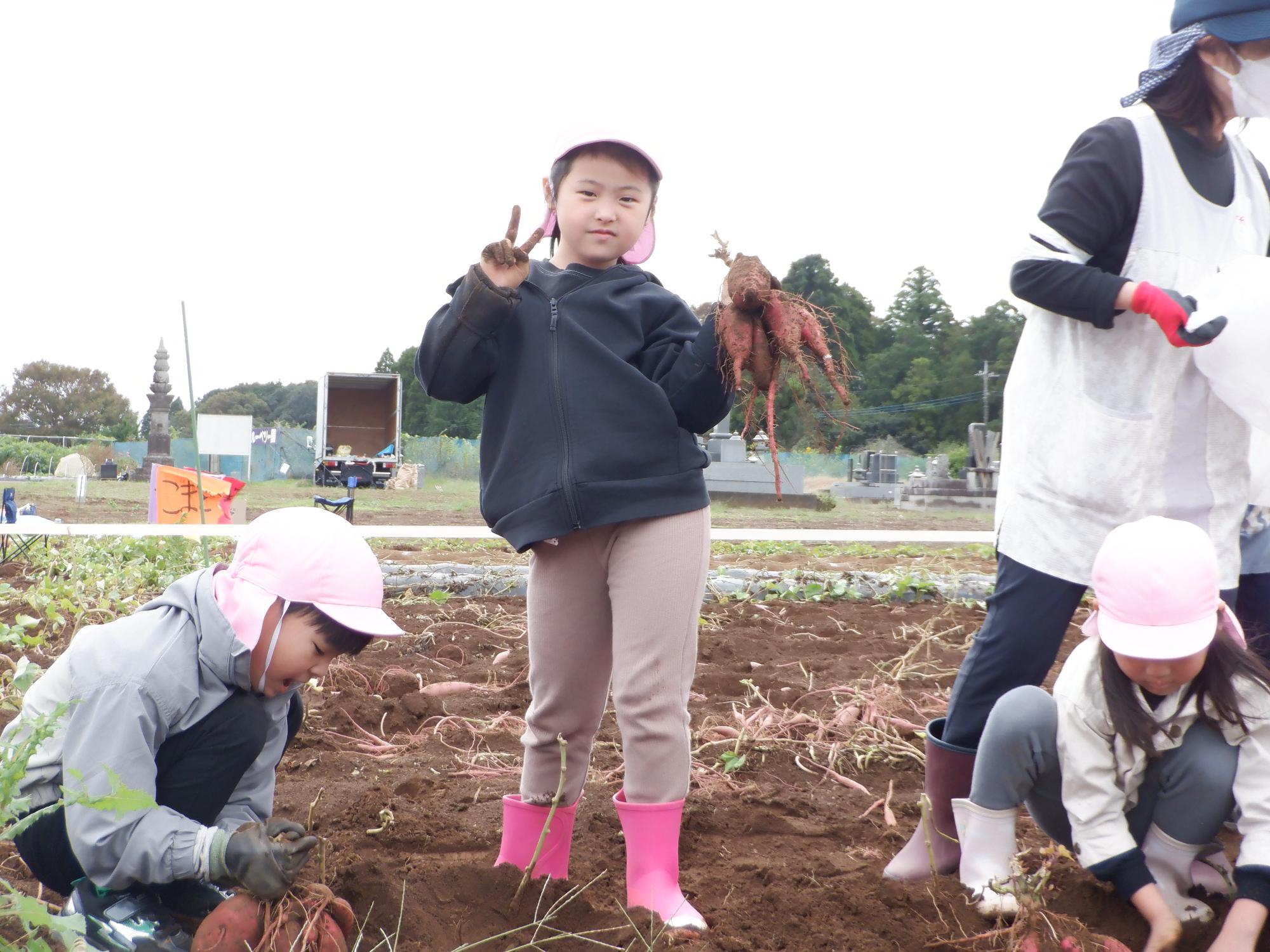 10月23日(木曜日)、道の駅くりもとで芋掘り体験をしました。道の駅くりもとには広いさつまいも畑が広がっていました。その中の一部をお借りして、さつもいもほりをしました。今年の品種は「くりかぐや」です。畑の土を少しずつ掘り進めます。子ども達の小さな手で掘るのはなかなか骨がおれます。それでも、子ども達は一生懸命掘り進め、たくさんのおいもを掘り出しました。掘り終えた子どもたちは、大きな芋を抱えながら、満足そうでした。いもほりのあとは、遊具で遊び、楽しいお昼となりました。手作りのお弁当を見せ合いながら、楽しくいただきました。思い出に残る体験となりました。
