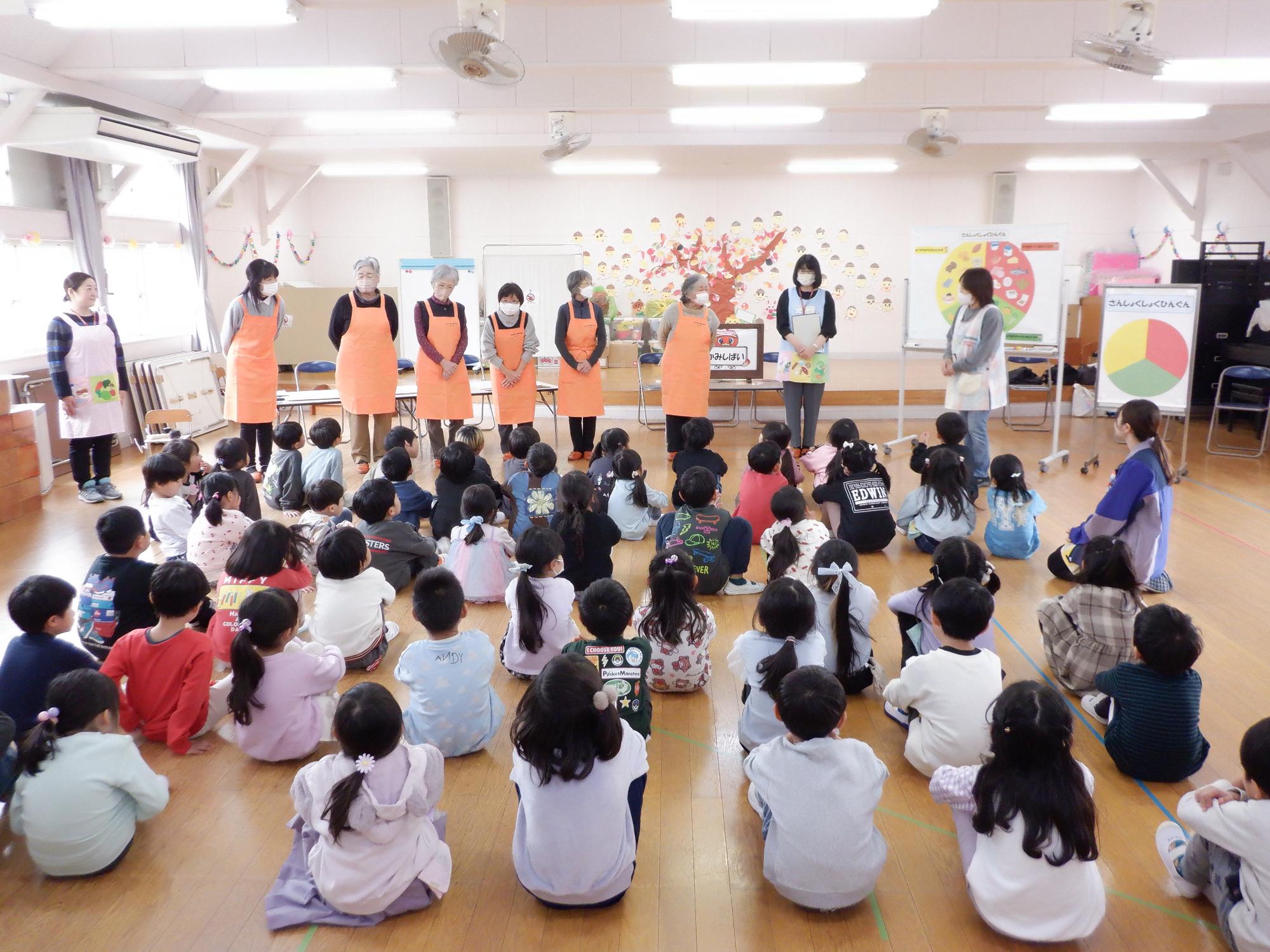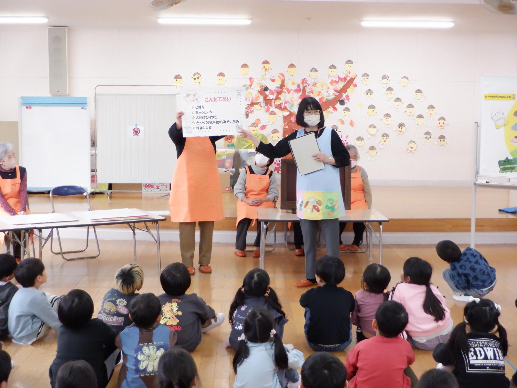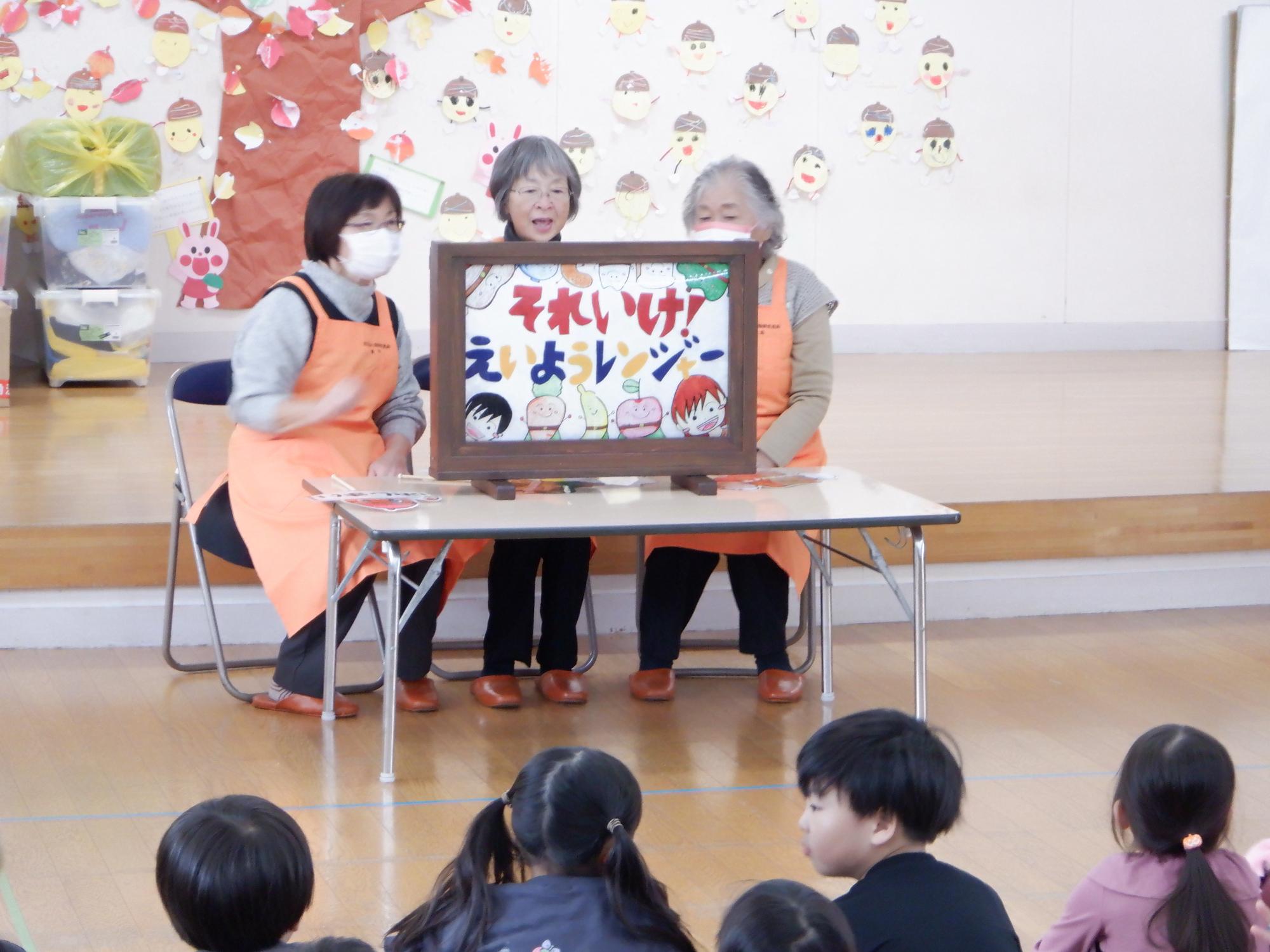 11月11日(火曜日)食育教室を行いました。講師は栄養士の日暮さんと木内さん、食育推進委員の皆さんです。紙芝居を通して、自分たちの身体は食べたものでできていること、赤、黄、緑の食材をバランスよく食べることが大事なことを学びました。今日の給食の献立もバランスよく作られていることを確認しました。最後に、「栄養の歌」をみんなで歌って楽しみました。