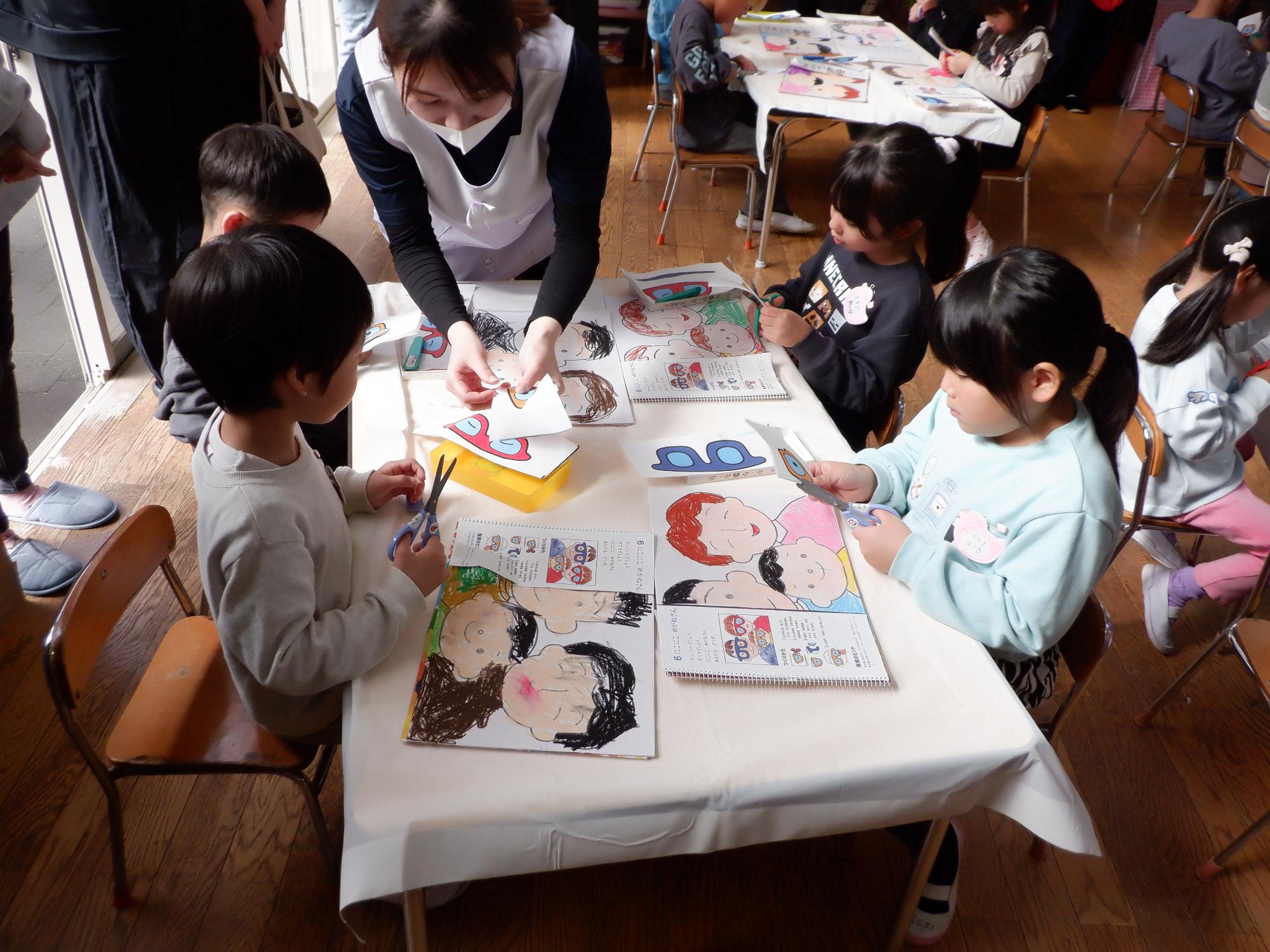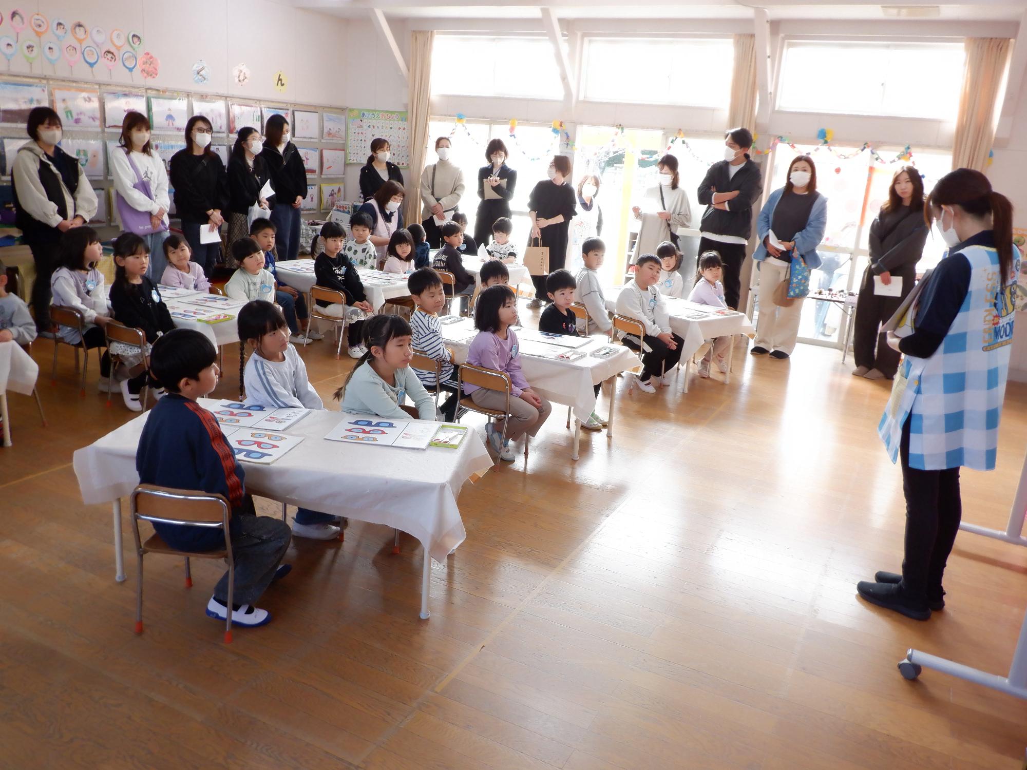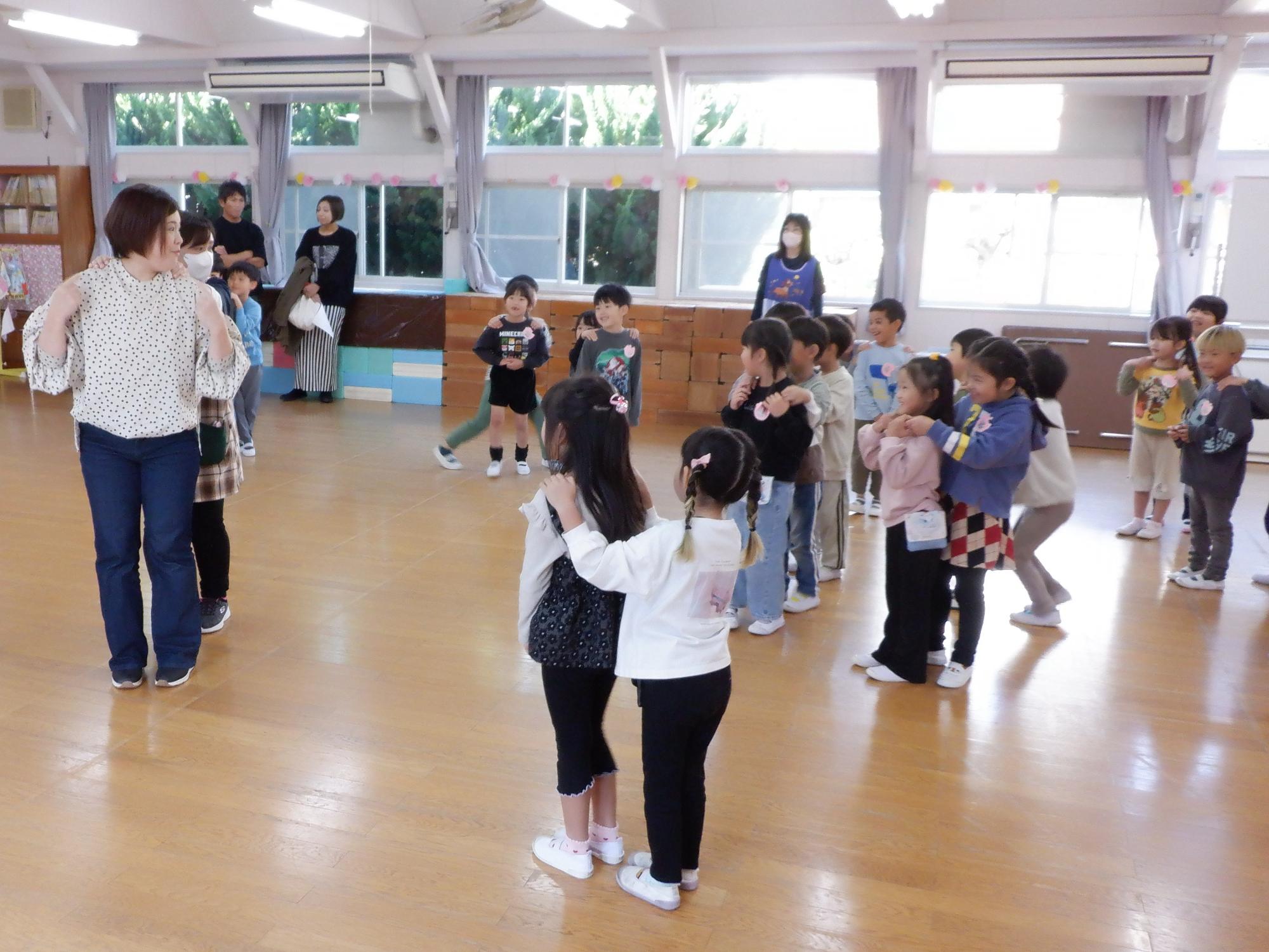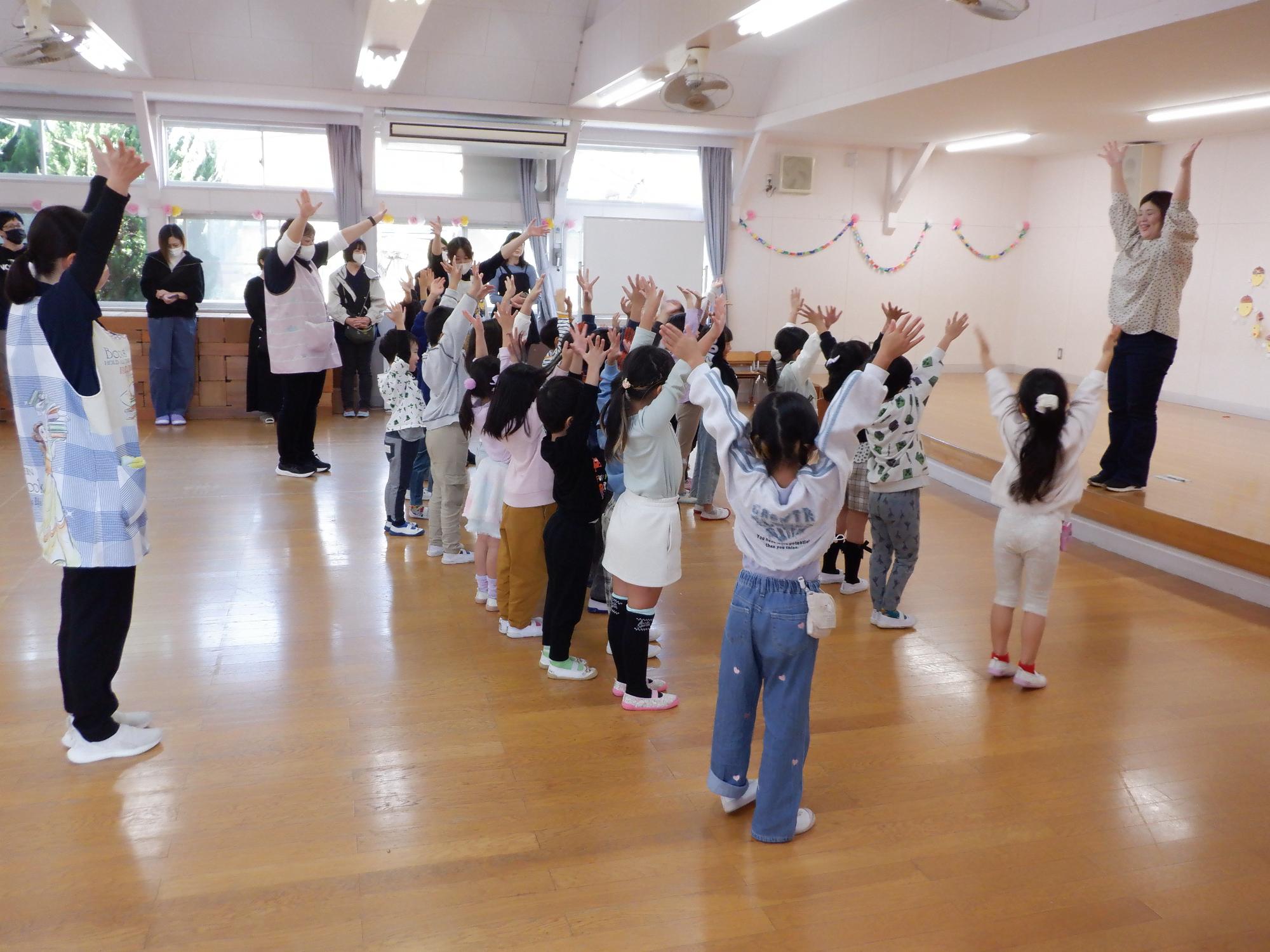11月7日(金曜日)保護者参観を行いました。そら組、にじ組クラス毎に2時間、子ども達の園での生活や学びの様子を保護者の皆様に見ていただきました。1時間は外部講師による音楽教室、もう1時間は切り紙ワークを行いました。切り紙ワークでは、話をよく聞き、手順通りにはさみを使って重ね切りをする活動を行いました。音楽教室では、音楽に合わせて表現を楽しむ活動を行いました。