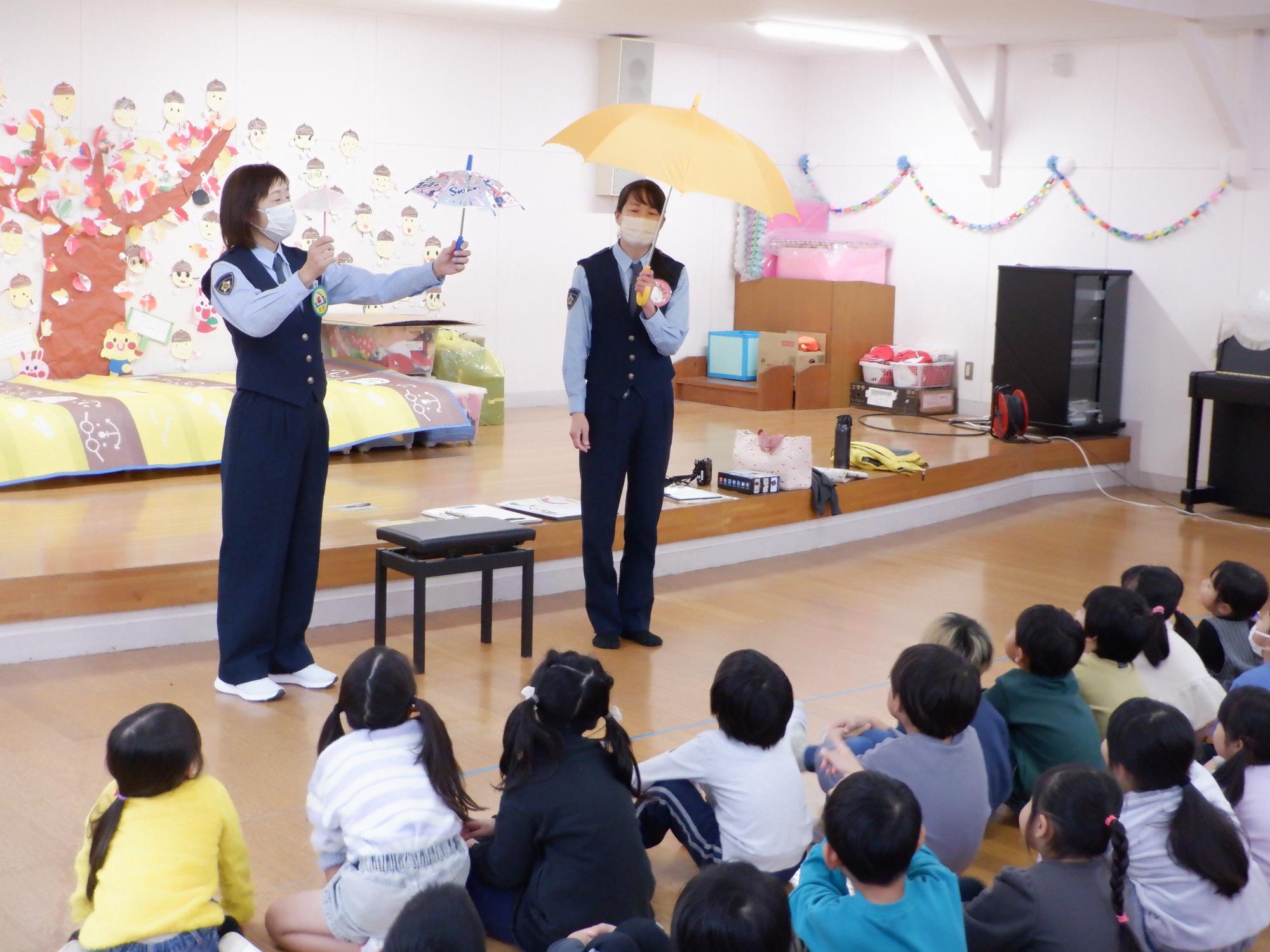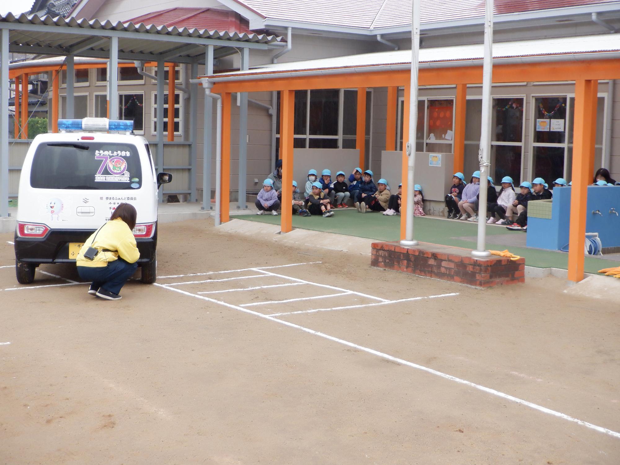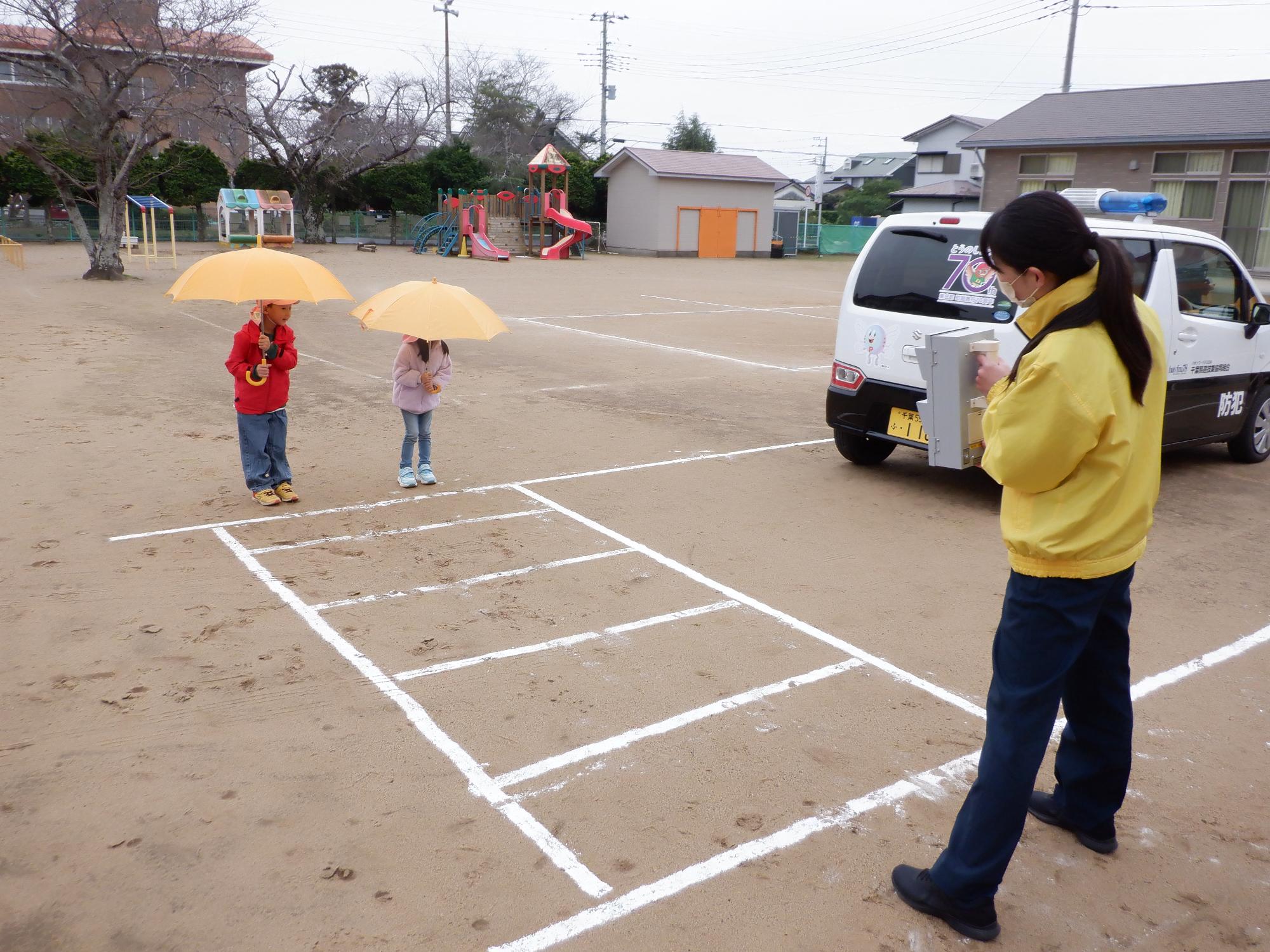 11月13日(木曜日)第4回の交通安全教室を行いました。今回は「雨の日の交通安全」「車の死角」「防犯」の3つについてです。雨の日の歩き方について、実際に園庭を傘をさして歩き、いつもより気をつける意識を持つことを学びました。また、車には死角があり、車の周囲には、運転手から見えにくい場所があることを教えていただきました。防犯では、知らない人に声をかけられても決してついていかないことを改めて確認しました。