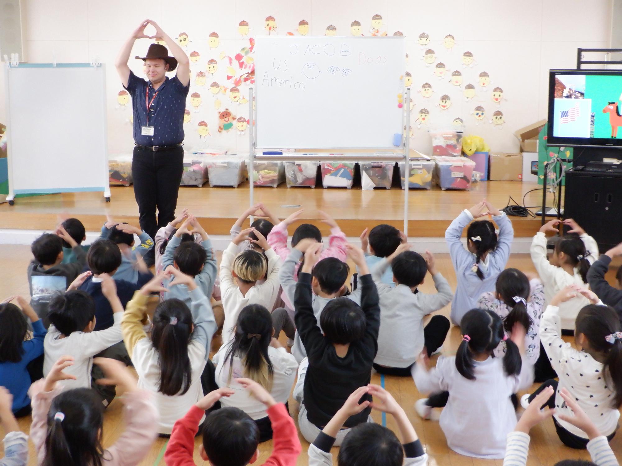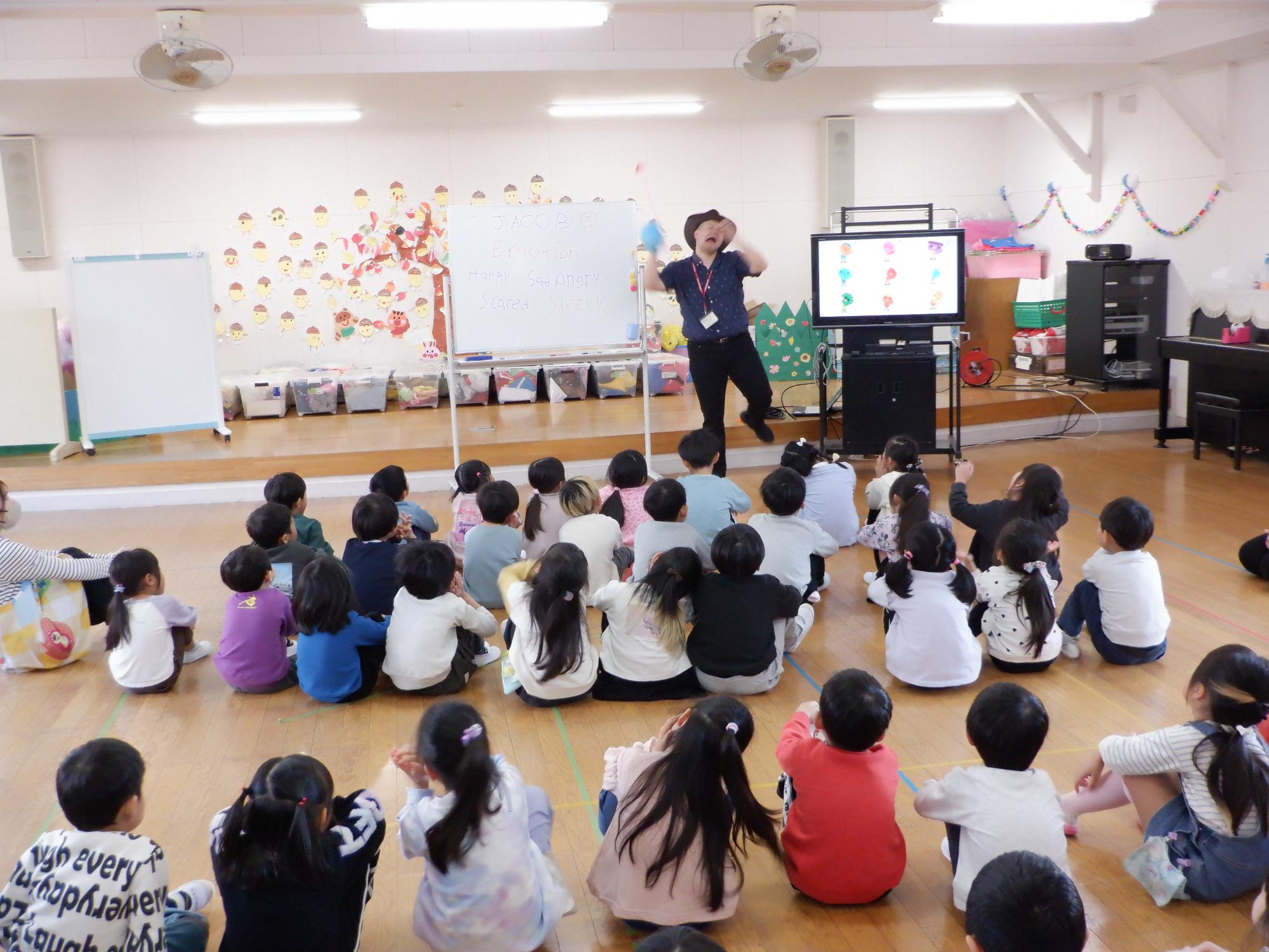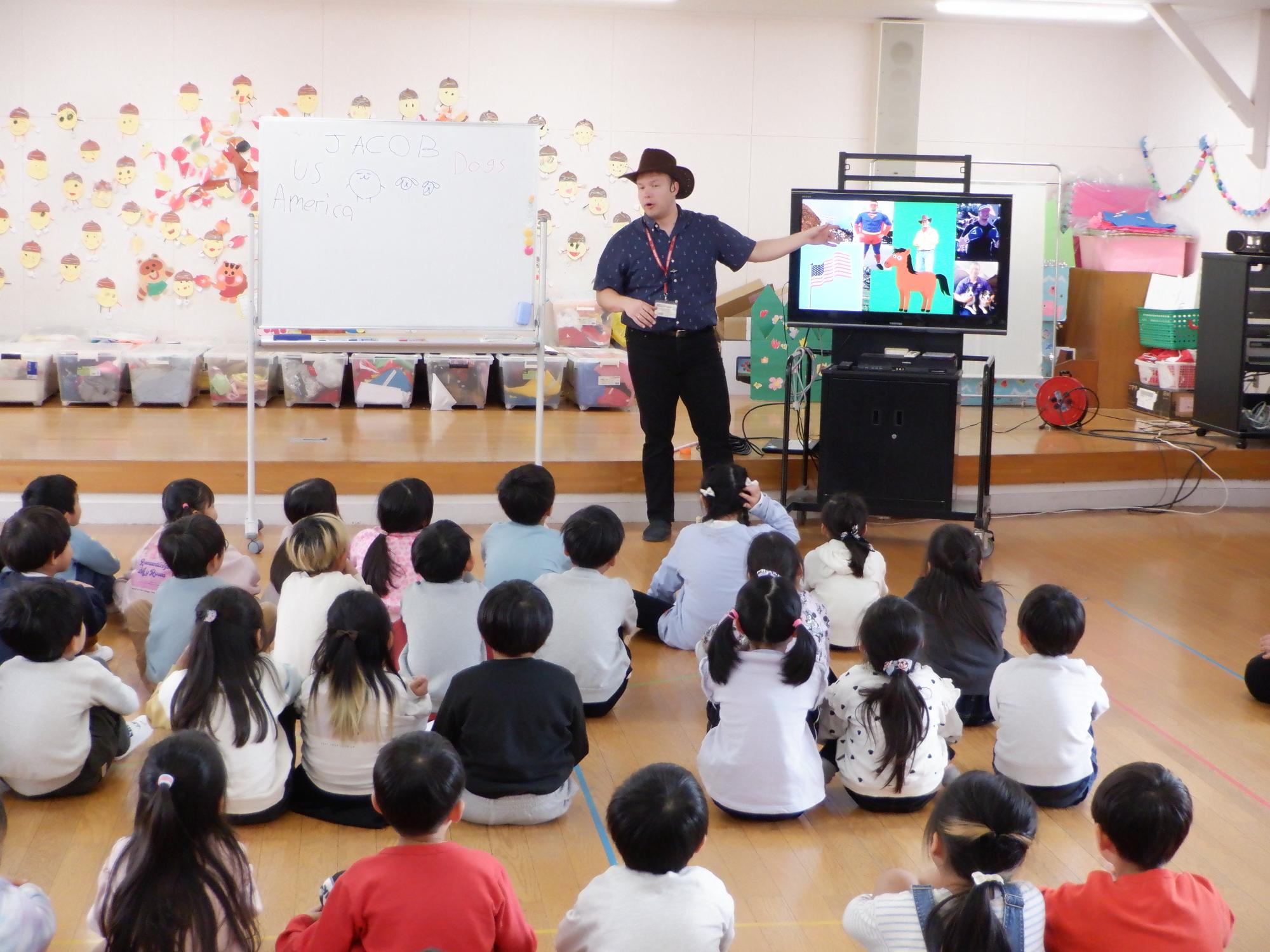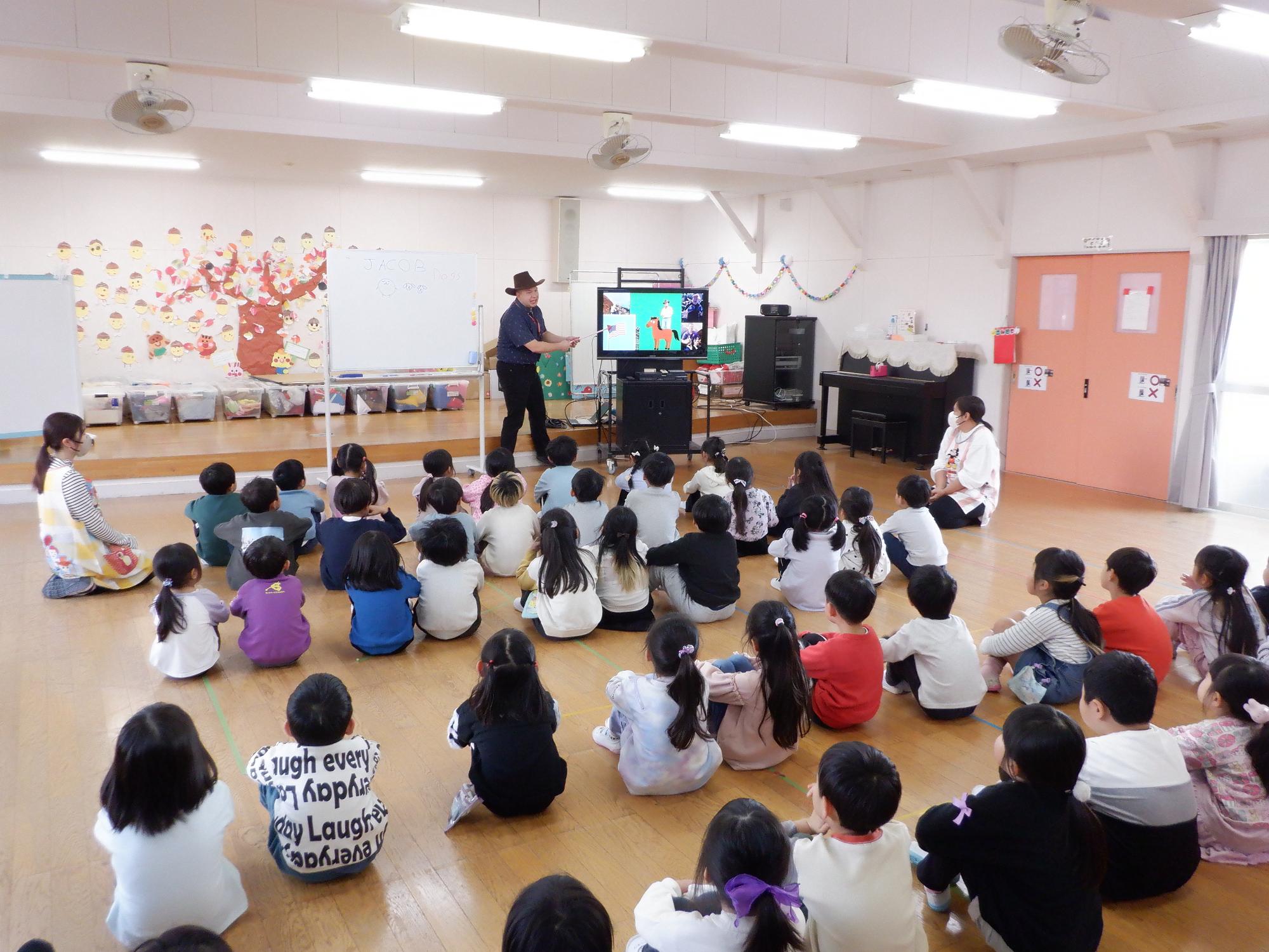 11月26日(水曜日)東庄中学校ALTのジェイコブ・マーティン先生がお見えになり「英語で遊ぼう」を行いました。今回は第2回です。ディスプレイに映った画面を見ながらジェイコブ先生のお話を聞きました。また、先生の英語の歌とジェスチャーに合わせて一緒に踊りました。園児が楽しく英語に親しむ時間になりました。