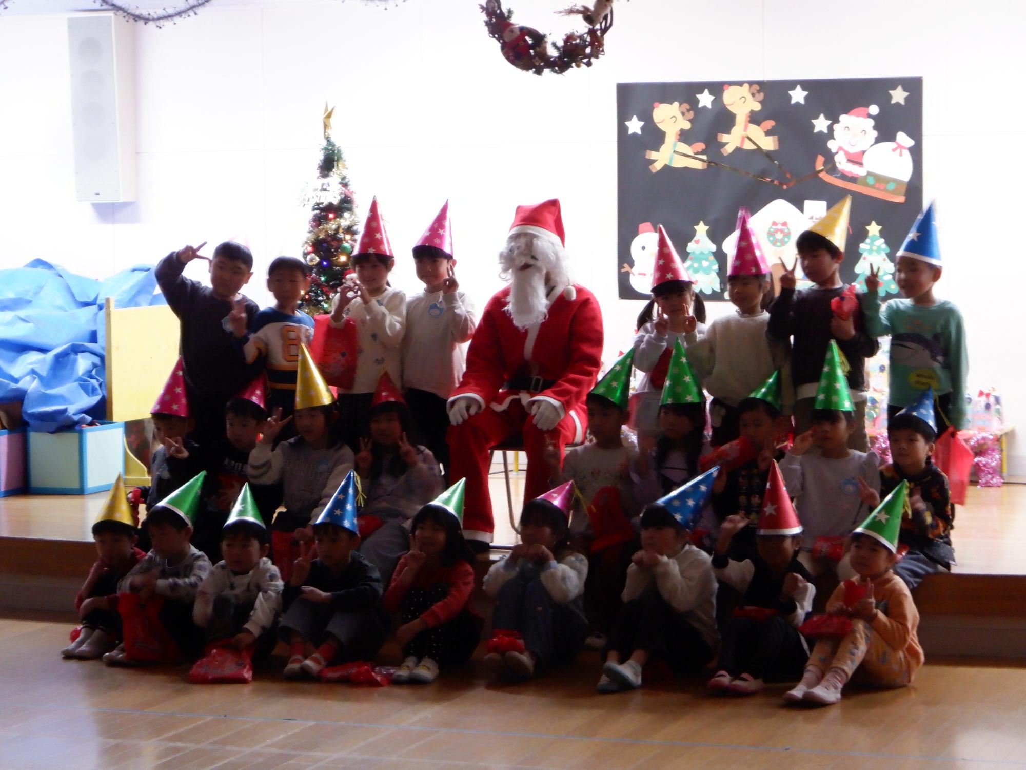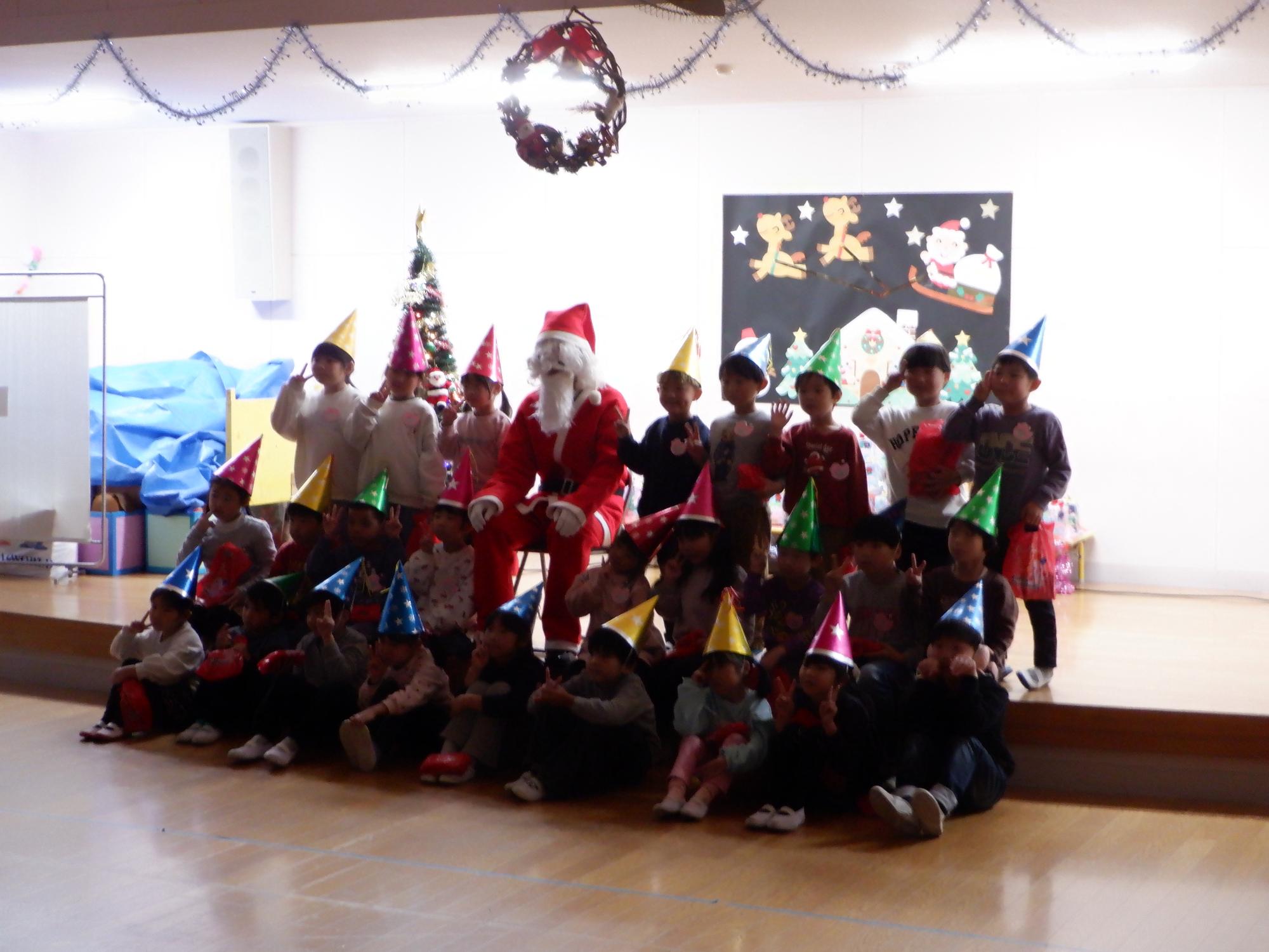 12月19日(金曜日)クリスマス会を行いました。こども園にサンタさんがやってきました。子どもたち一人ひとりにプレゼントを持ってやってきました。子どもたちは、サンタさんからプレゼントをもらい嬉しそうでした。先生方から絵本の読み聞かせ、ブラックシアターでのお話があり楽しんでいました。その後は、みんなでケーキとジュースでひとあし早いクリスマスをしました。