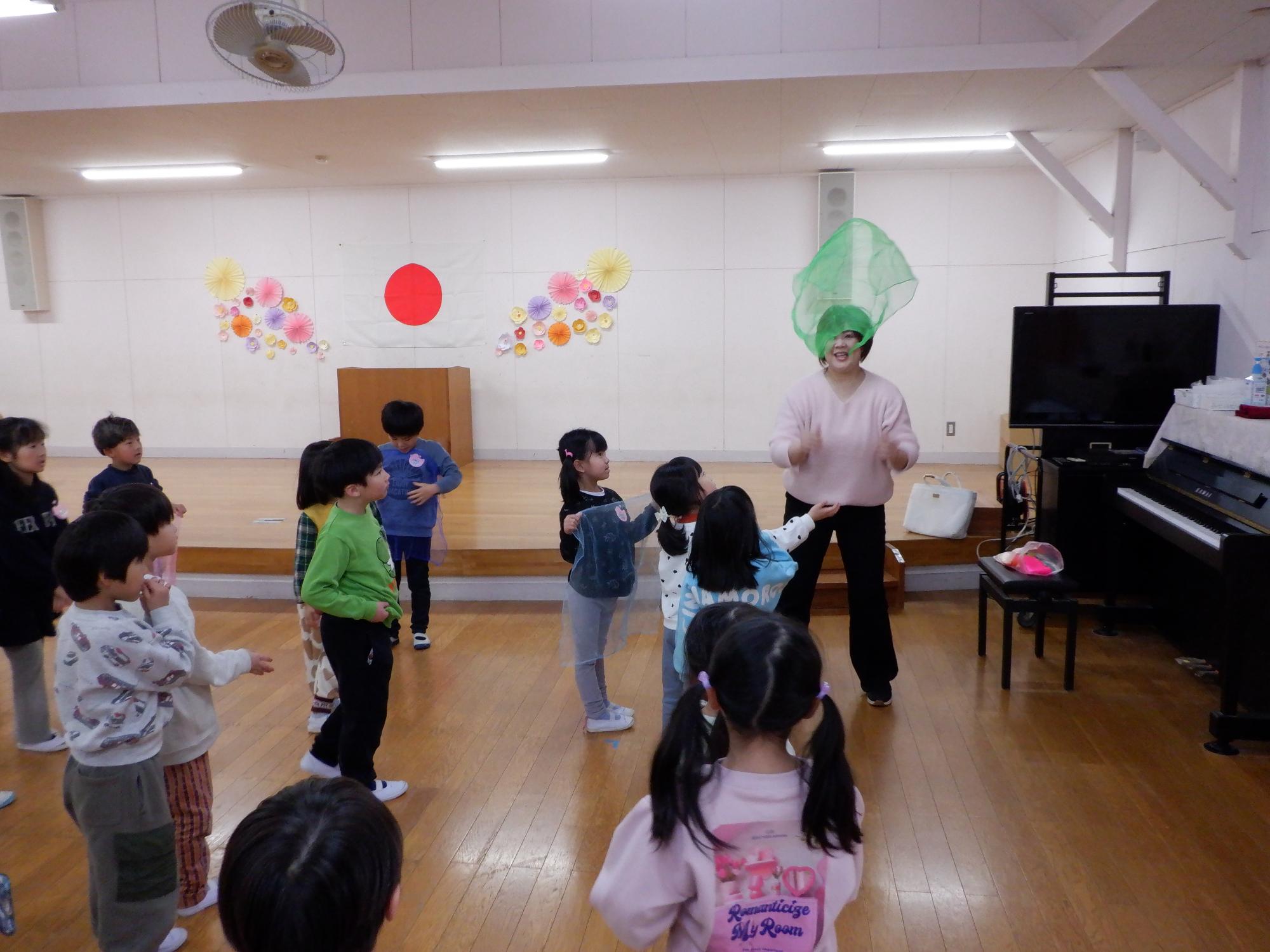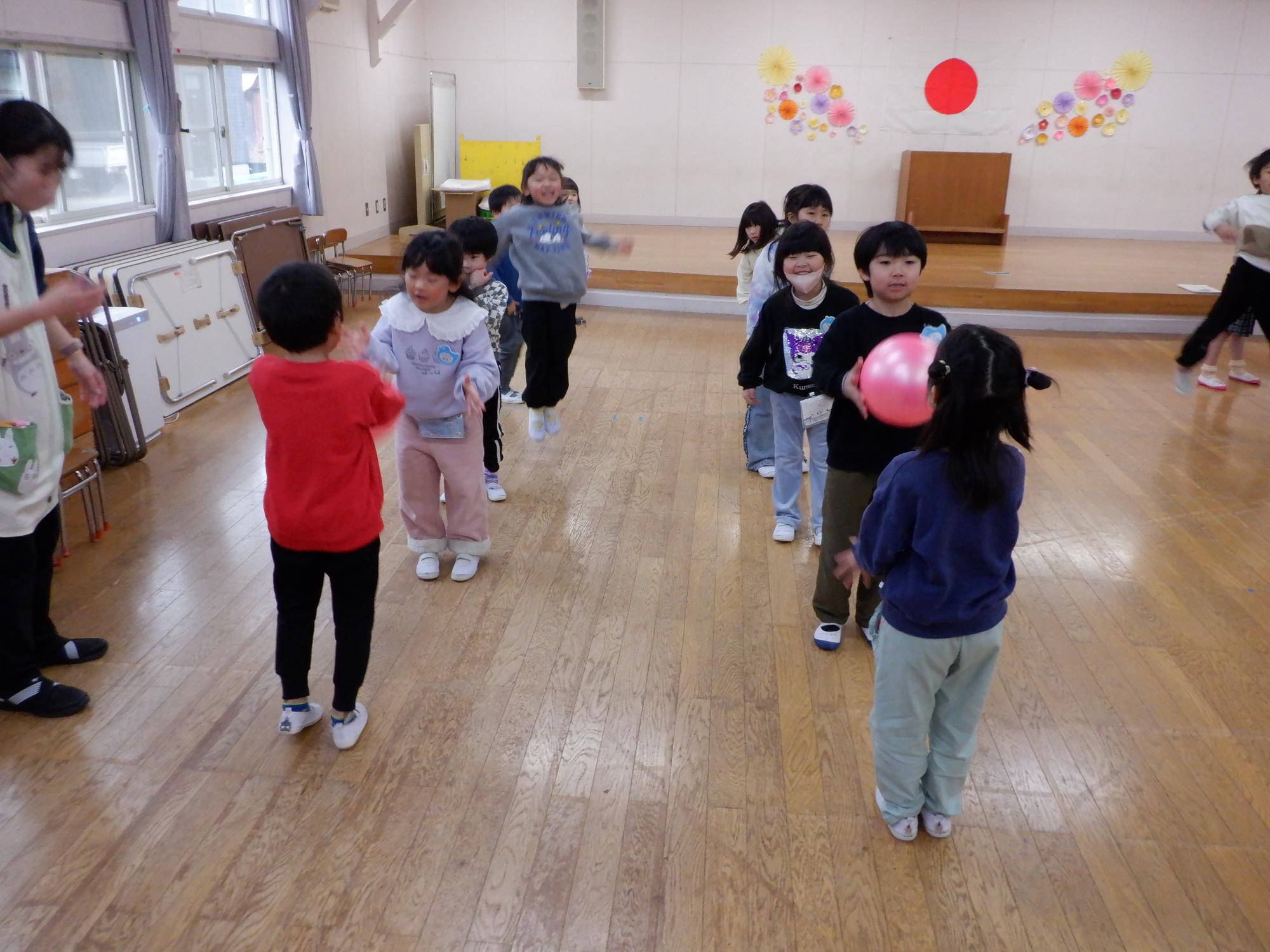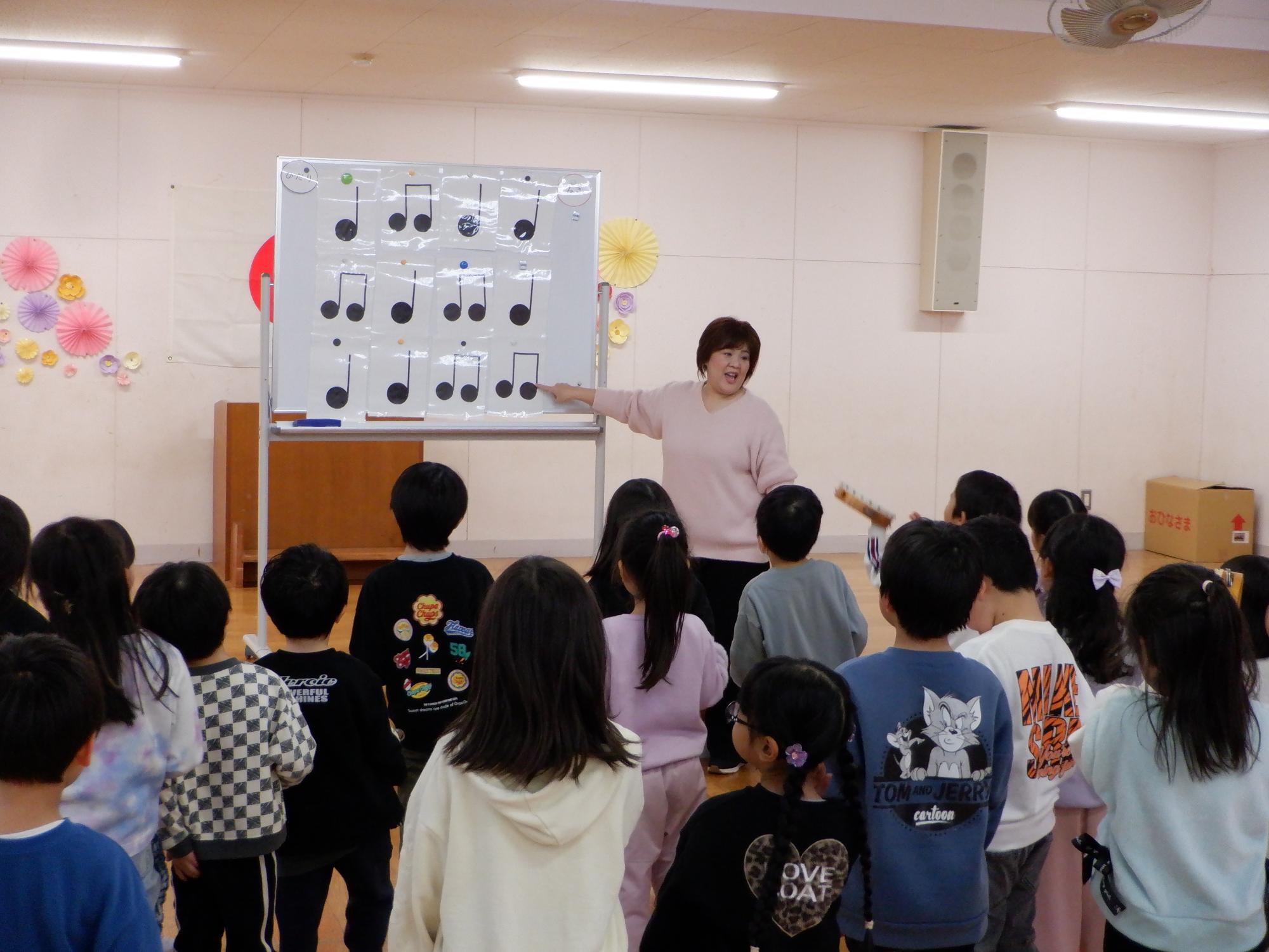 2月27日(金曜日)本年度最後の音楽教室を行いました。はじめにピアノの音楽に合わせて体を動かすリトミックを行いました。ピアノのリズムに合わせて、速さを変えて動きました。次に4拍子のリズムに合わせてボール送りをしました。最後にタンバリンを持ちながらのリズム打ちです。最初は難しかった子どもたちも、最後はリズムをとることにだんだん慣れてきて上手に合わせて動くことができました。
