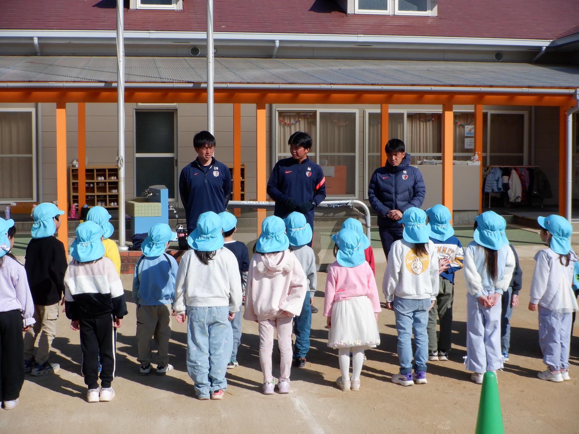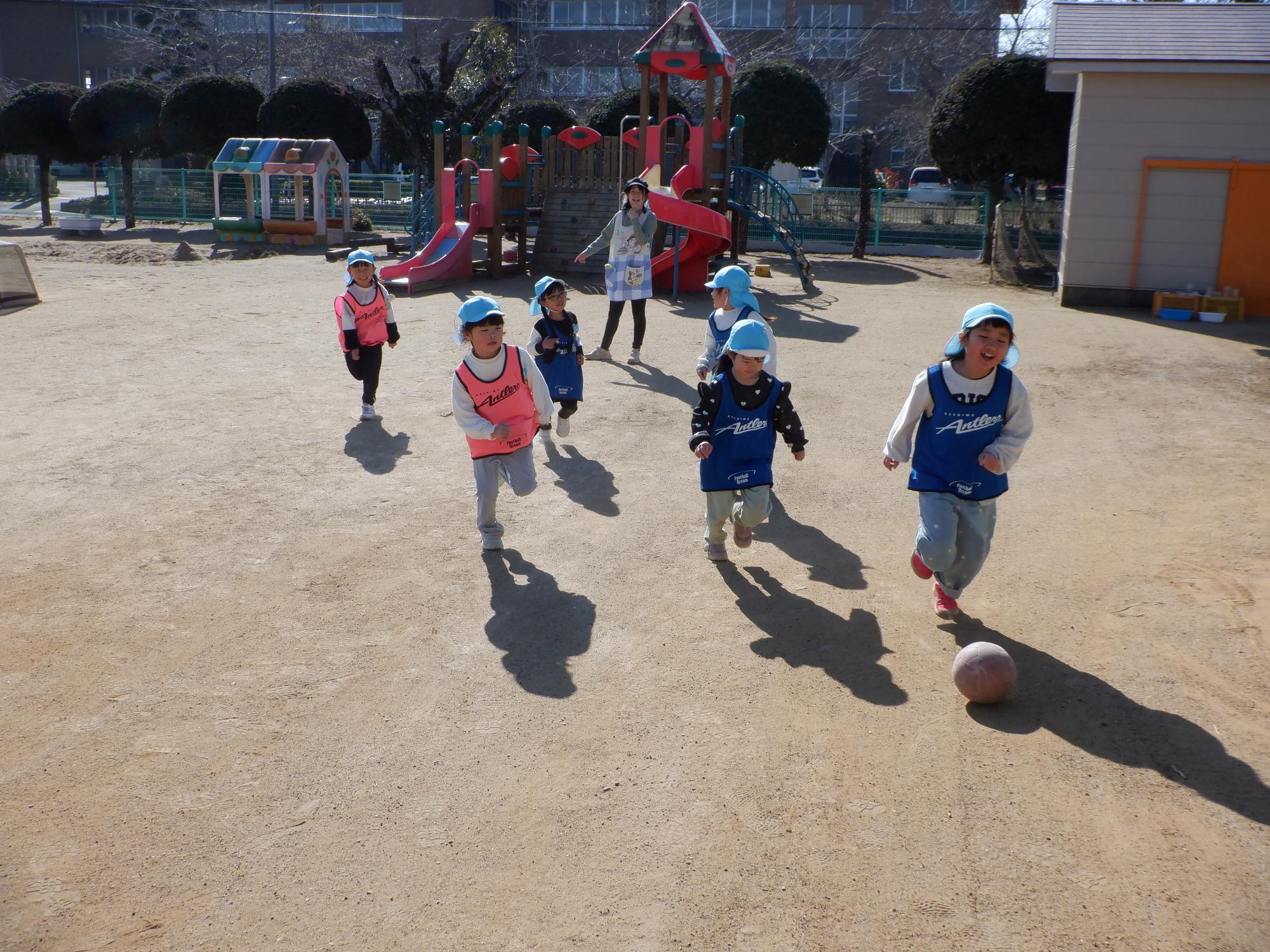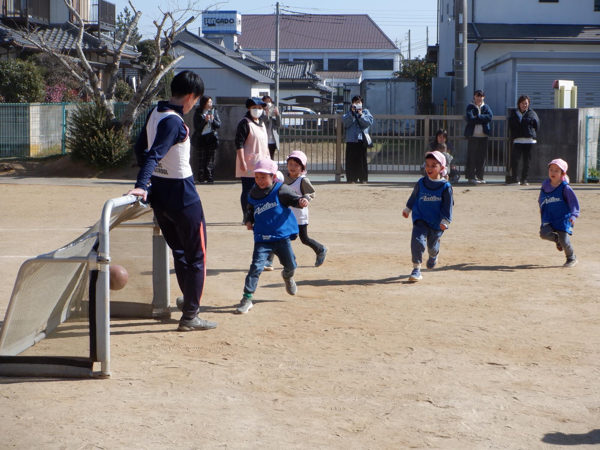 2月4日(水曜日)第3回サッカー教室を行いました。講師の先生はアントラーズのコーチ3人です。今回は本年度最後のサッカー教室です。3名のコーチは園児が楽しんでサッカーができるように工夫して指導してくださいました。ボールを使った準備運動、ボール慣れ、ドリブル、リレー、ミニゲームなど、たくさんの動きを教えていただきました。子ども達は、園庭いっぱい、懸命にボールを追いかけていました。参観された保護者の皆様、応援ありがとうございました。