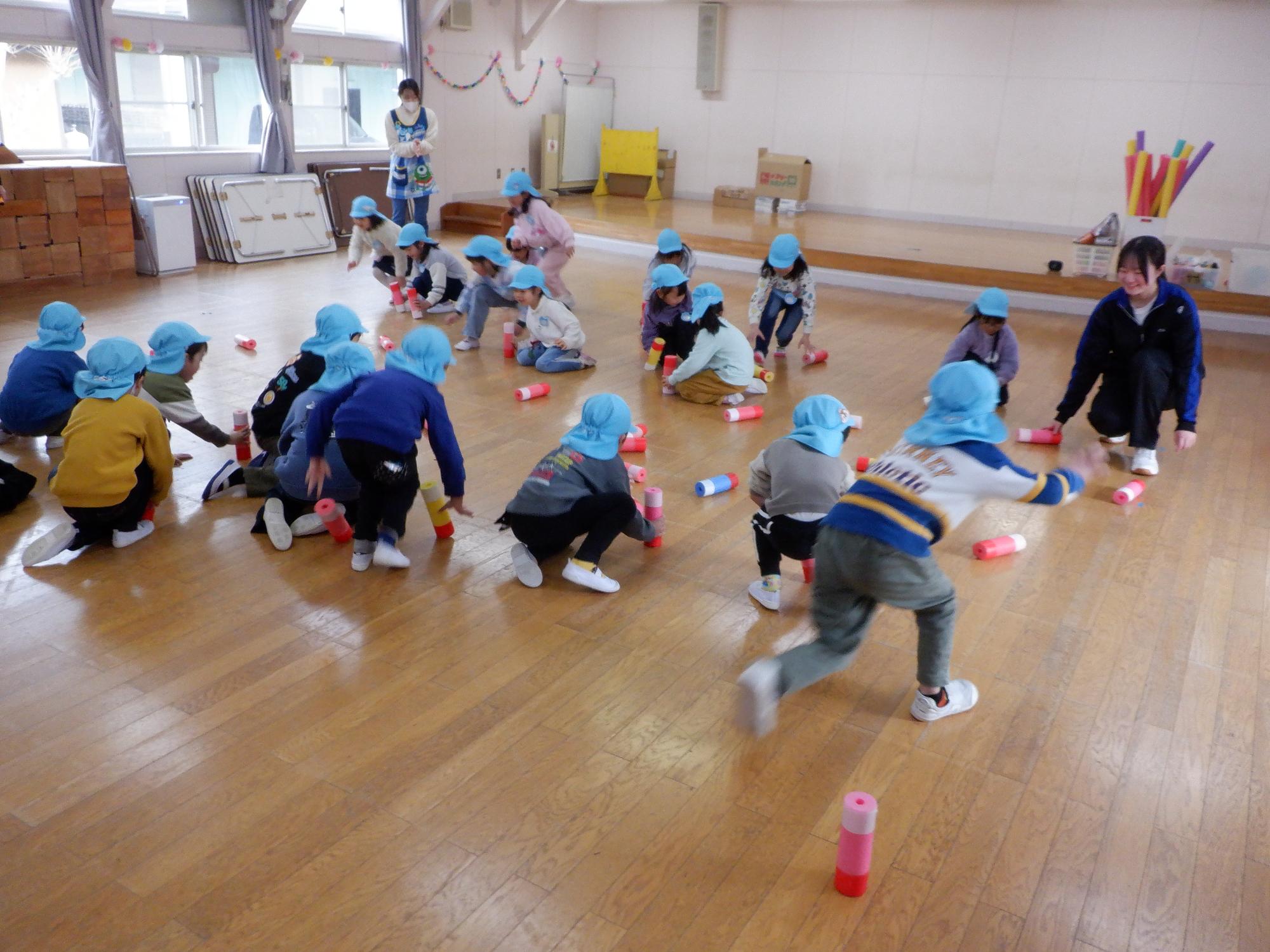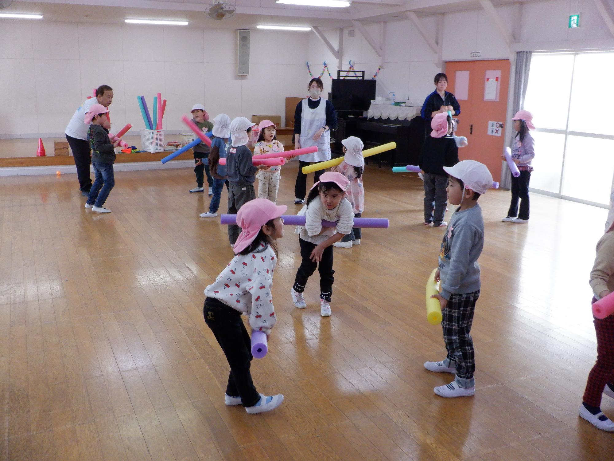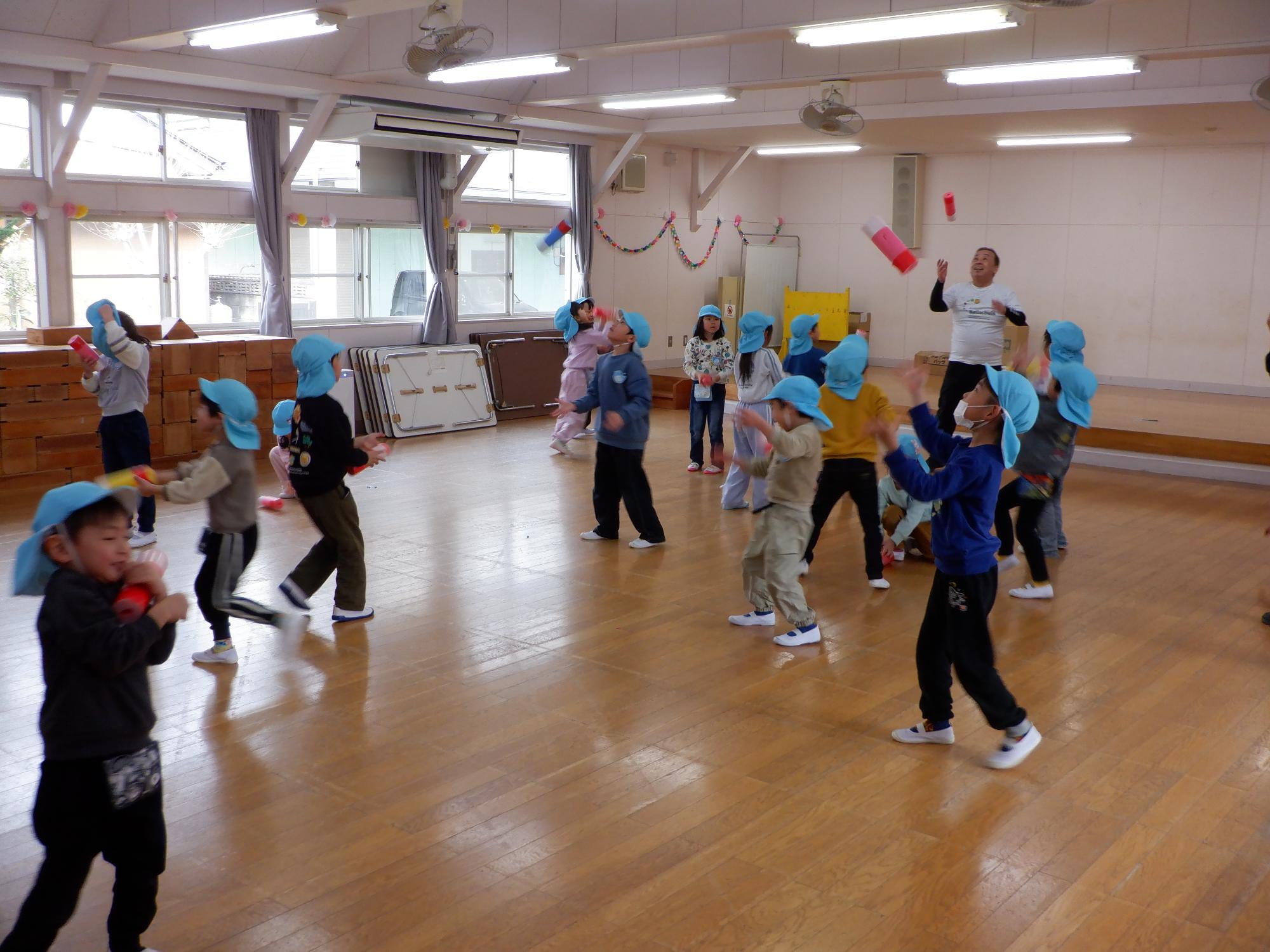 2月17日(火曜日)本年度最後の体操教室を行いました。講師は香取市教育委員会の多田先生です。今回はスティックを使って楽しく運動しました。スティックを遠くまで投げたり、投げ上げてキャッチしたり、2~3人組で息を合わせた運動やチーム対抗のゲームをしたりしました。いろいろな動きを経験して、大満足の子どもたちでした。