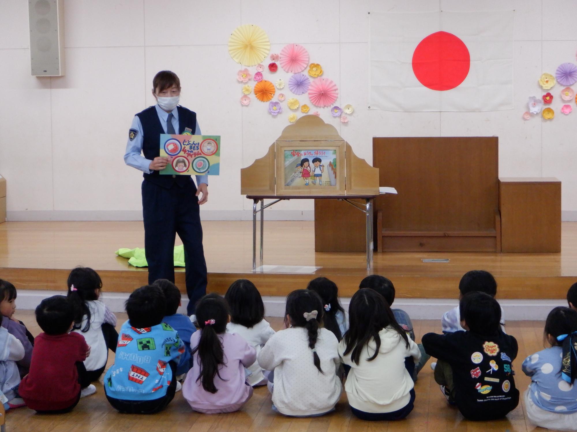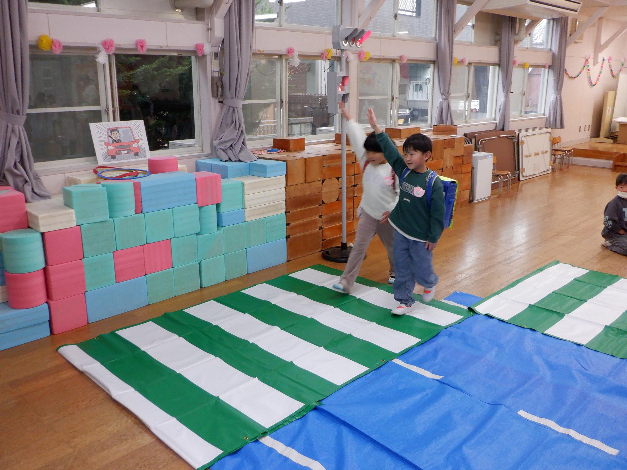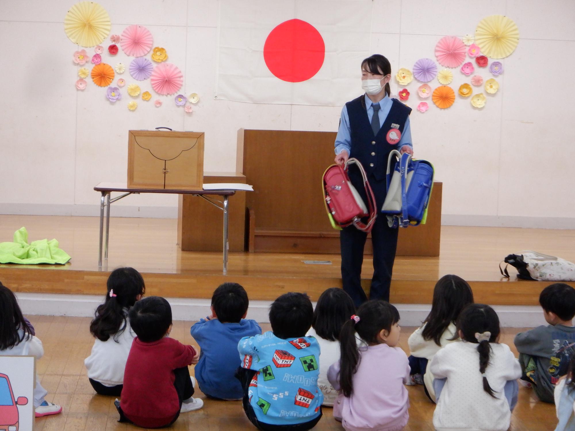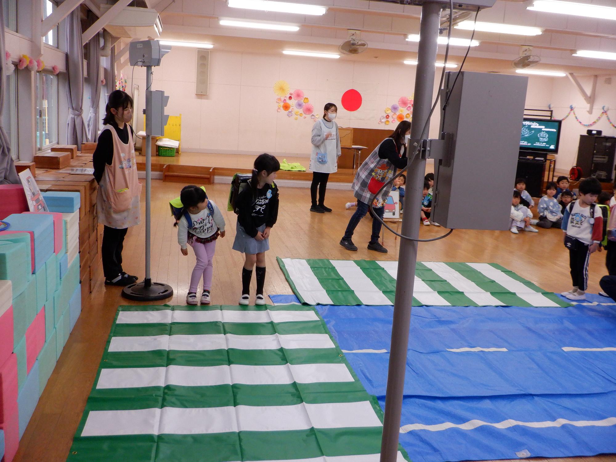 2月25日(水曜日)第6回交通安全教室を行いました。今回は実際に園周辺の道路を歩く予定でしたが、あいにくの大雨で室内での実施となりました。室内に用意した模擬道路で歩く練習をしました。小学校入学に備えてランドセルを背負って歩きました。最後に紙芝居を見ながら防犯の話を聞きました。入学前にお家の方と一緒に学校までの登下校の道の歩き方、スクールバス乗降場所までの歩き方について練習できると安心です。