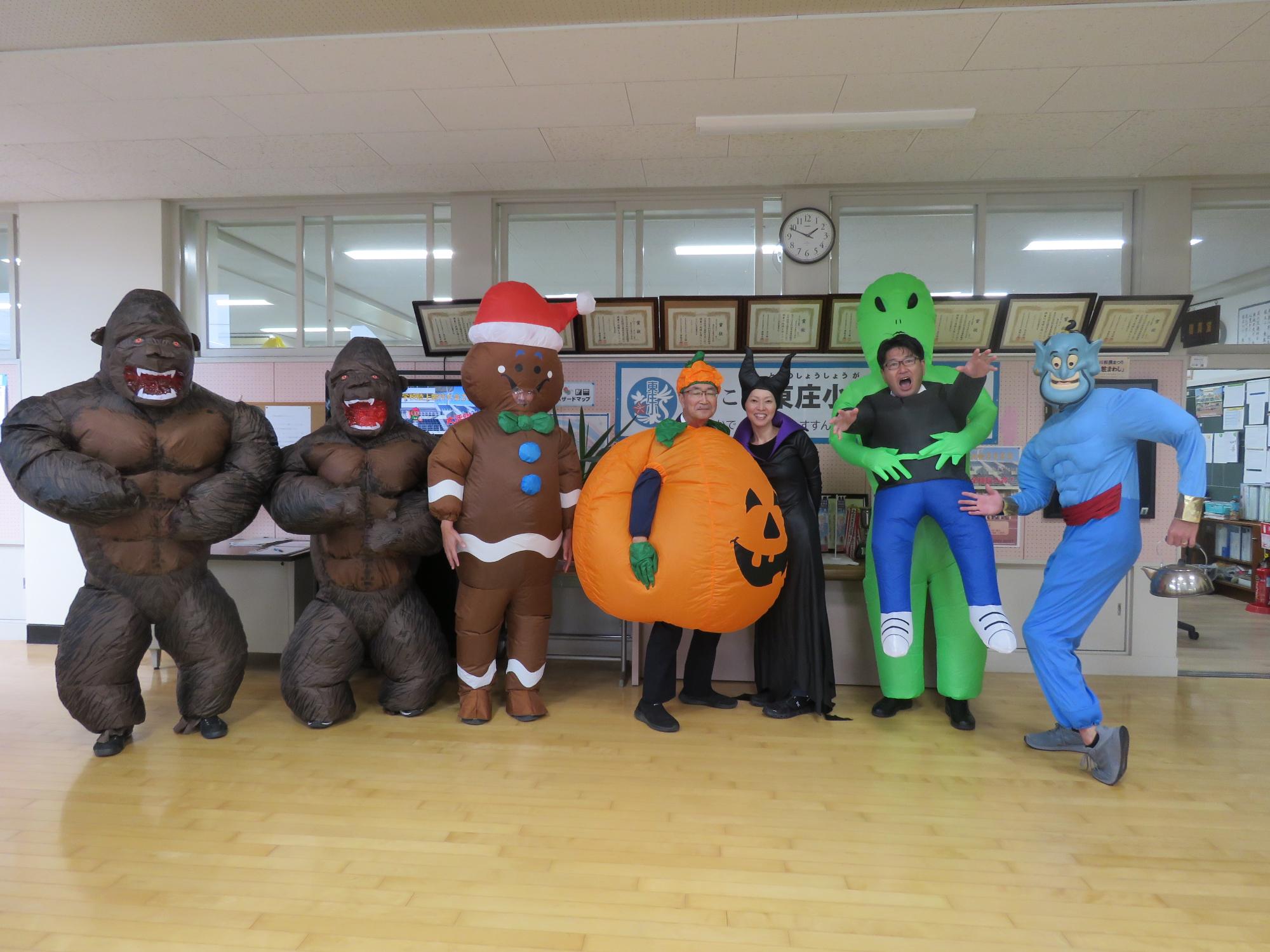 東庄小では毎年ハロウィンの時期になると、子どもではなく先生方が仮装をし、教室を練り歩きます。今年は、子どもたちに楽しんでもらおうと、過去最大の7人のキャラクターが登場しました。
