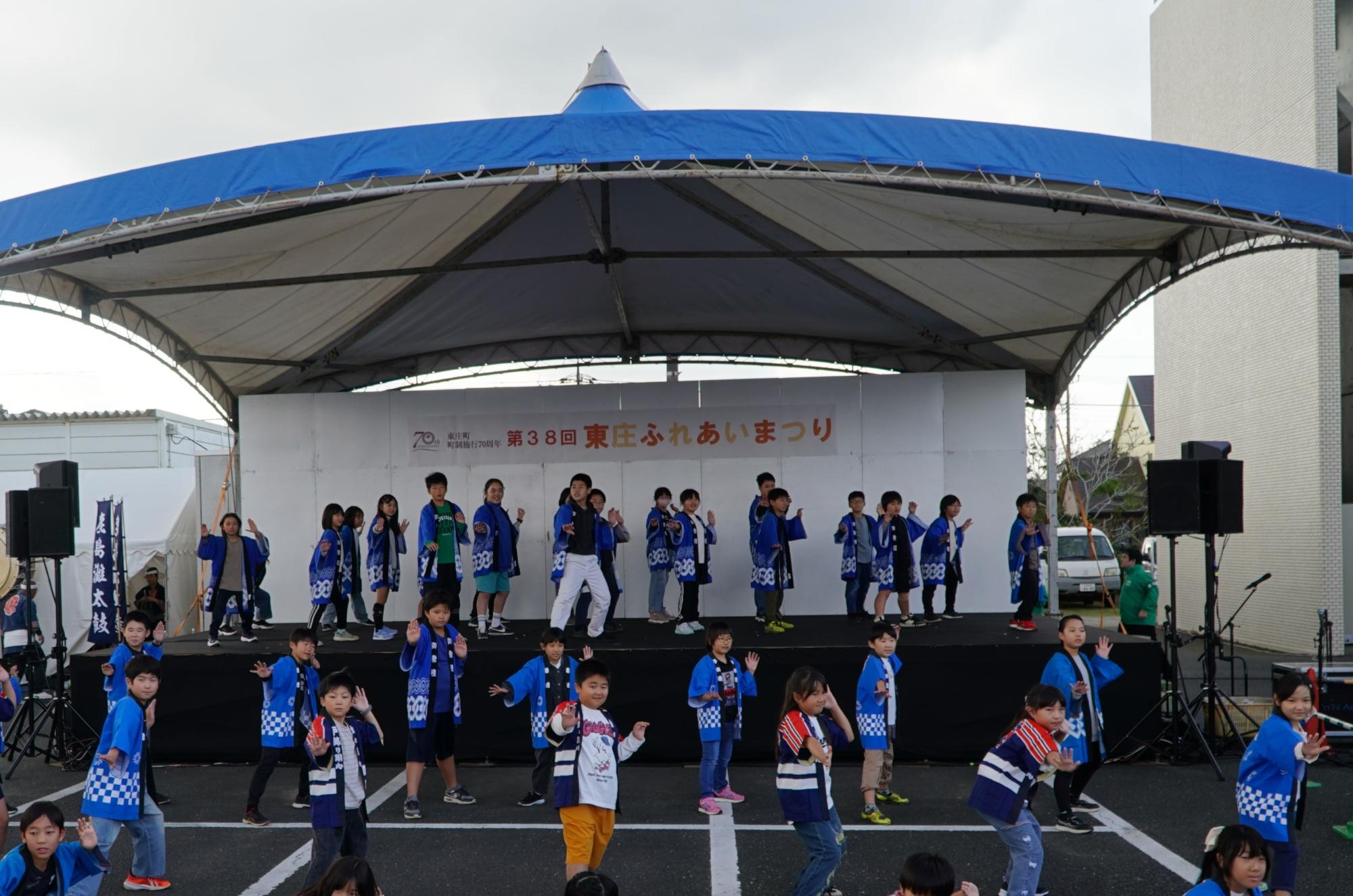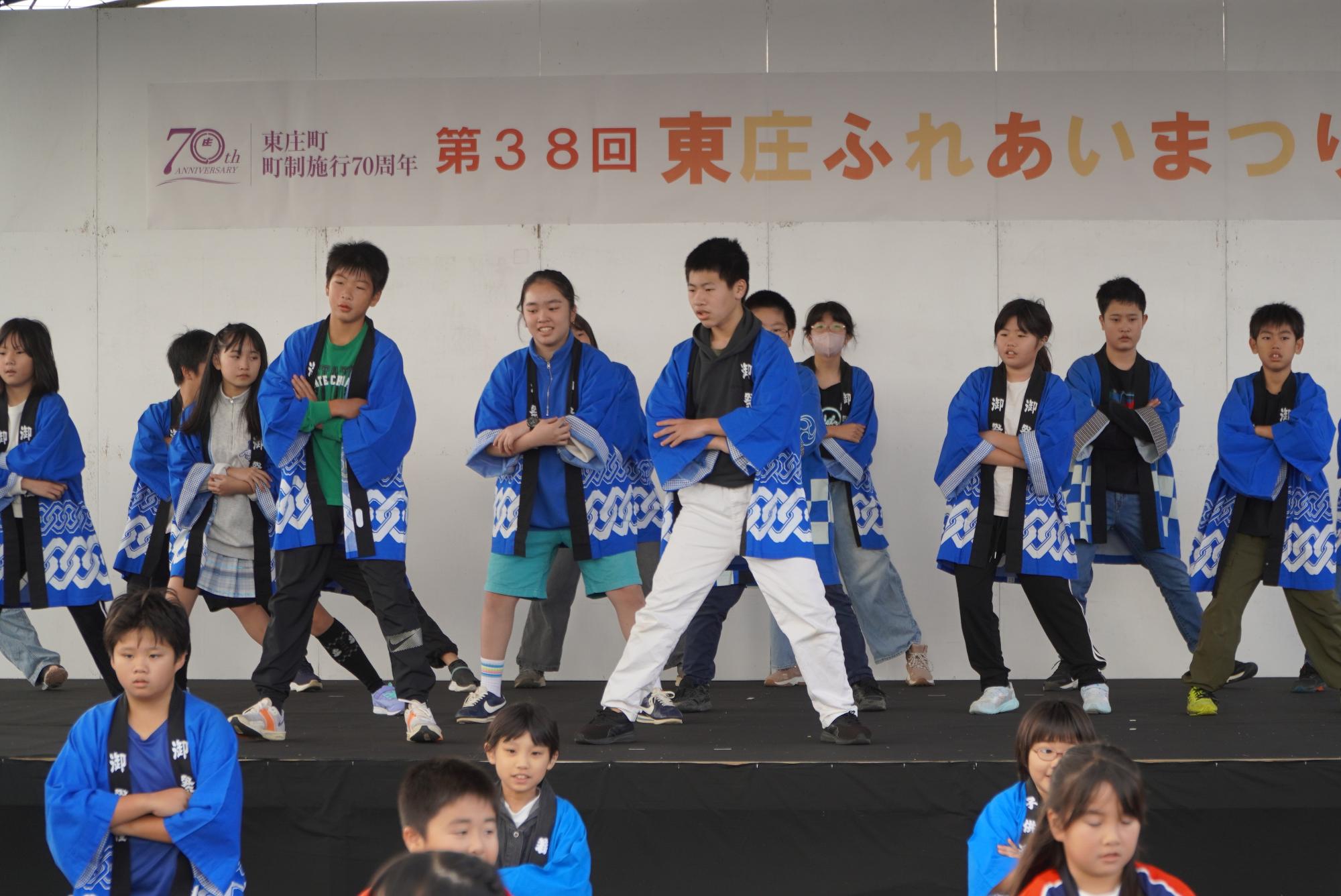 東庄小学校からは4・5・6年生の有志がステージ出演し、運動会で踊った「よさこいソーラン」を披露しました。今年は、竜神台区からご寄付いただいた法被を纏っての演舞となりました。