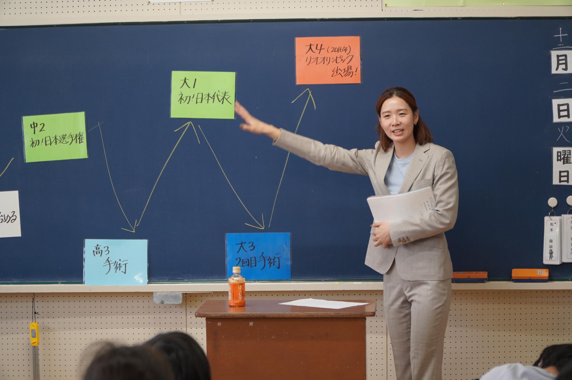 寺村さんは千葉県出身の競泳選手として国内外の大会で活躍。講演では、2度の膝の手術を経て念願のオリンピック出場を果たした経験を基に、目標設定のコツ、チャレンジすることの大切さ、モチベーションの維持、自信を持つための思考法などを伝えてくださいました。