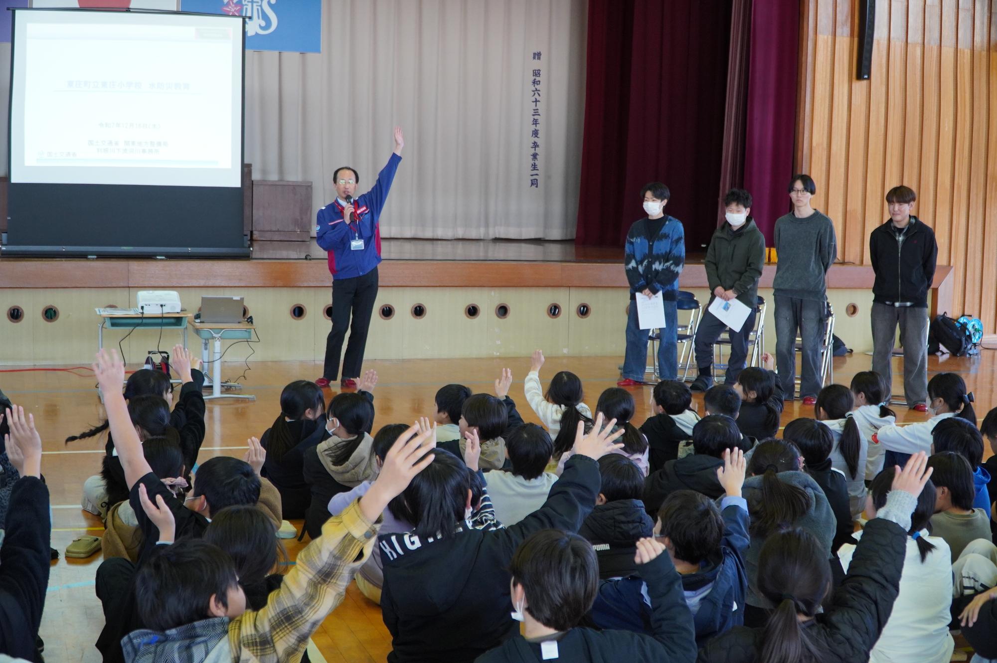 12月18日(木曜日)、4年生は国土交通省関東地方整備局利根川下流河川事務所が主催する水防教室を受講しました。千葉科学大学の4名の大学生が、利根川下流域の災害についてわかりやすく教えていただきました。もしもの場合の避難想定や避難先についてたくさんのことを学びました。ご指導いただいた皆様、ありがとうございました。