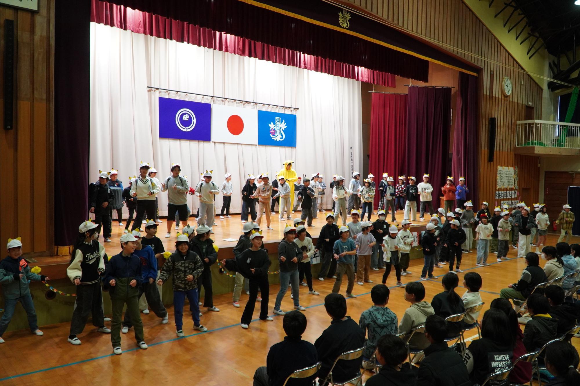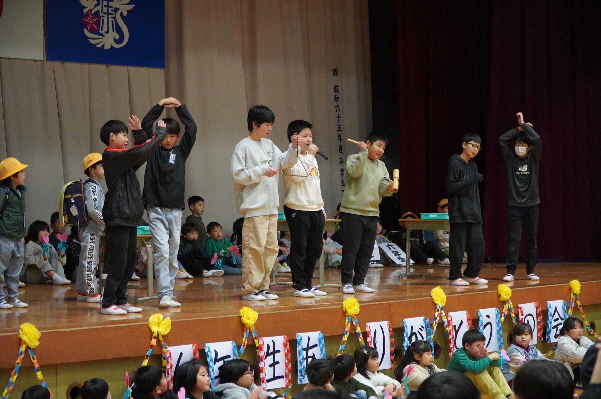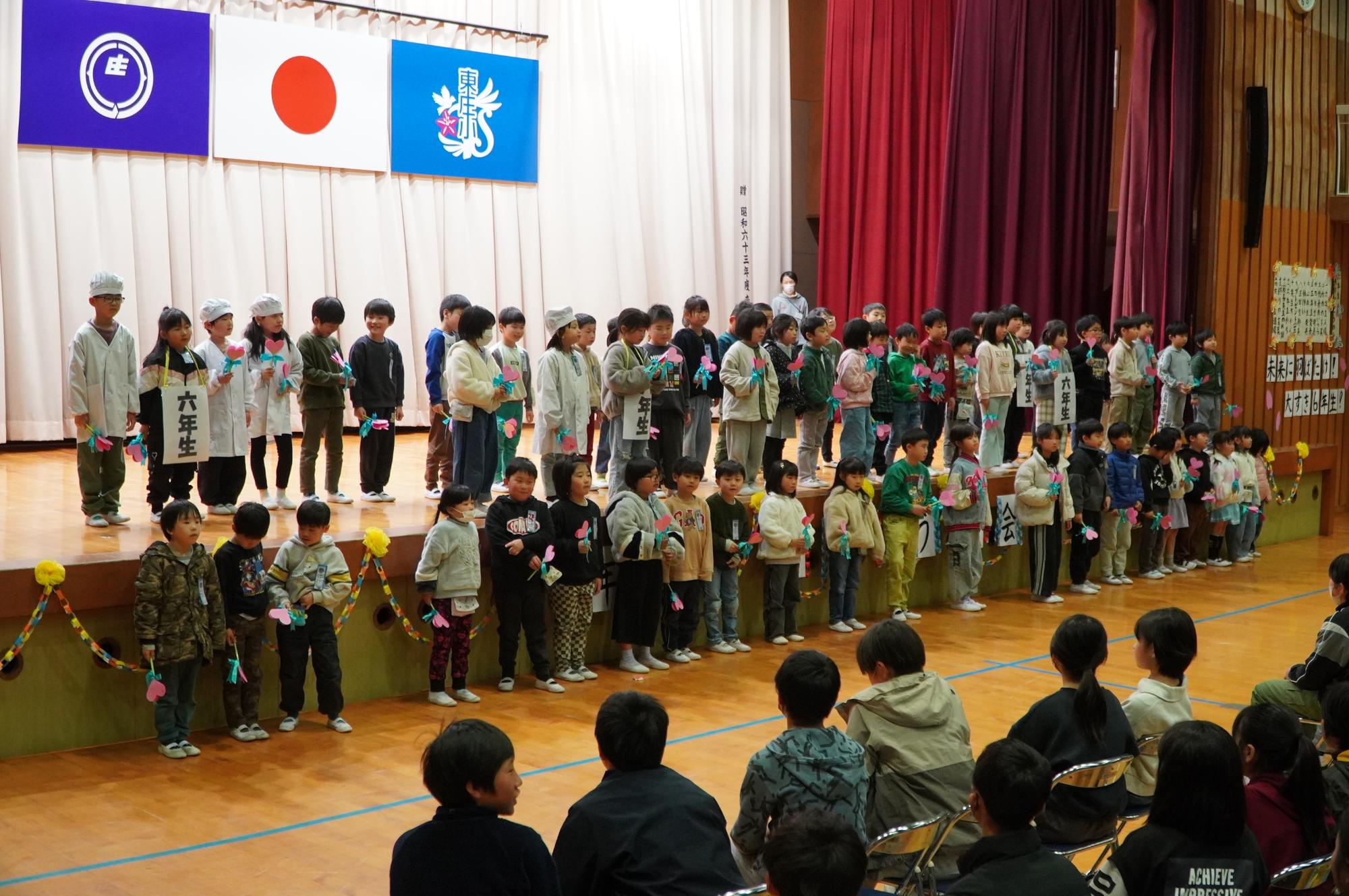 これまで東庄小学校を支えてくれた6年生に感謝と応援の気持ちを込めて、1年生~5年生が歌やダンス、劇などの出し物を発表しました。