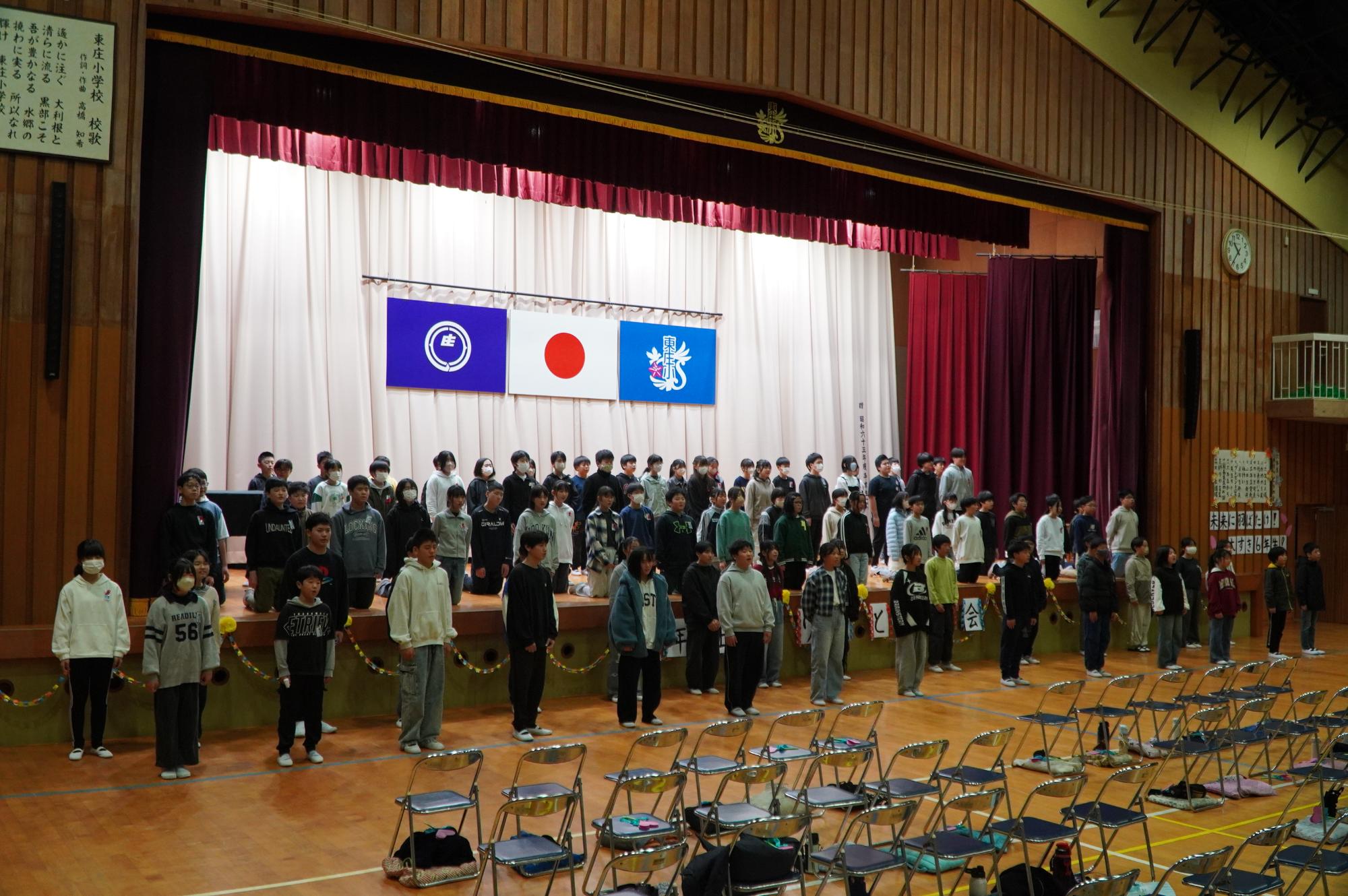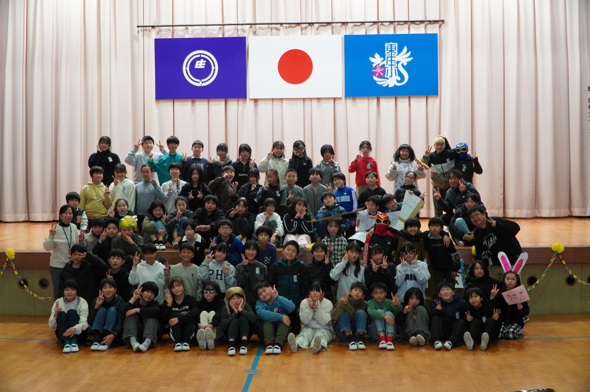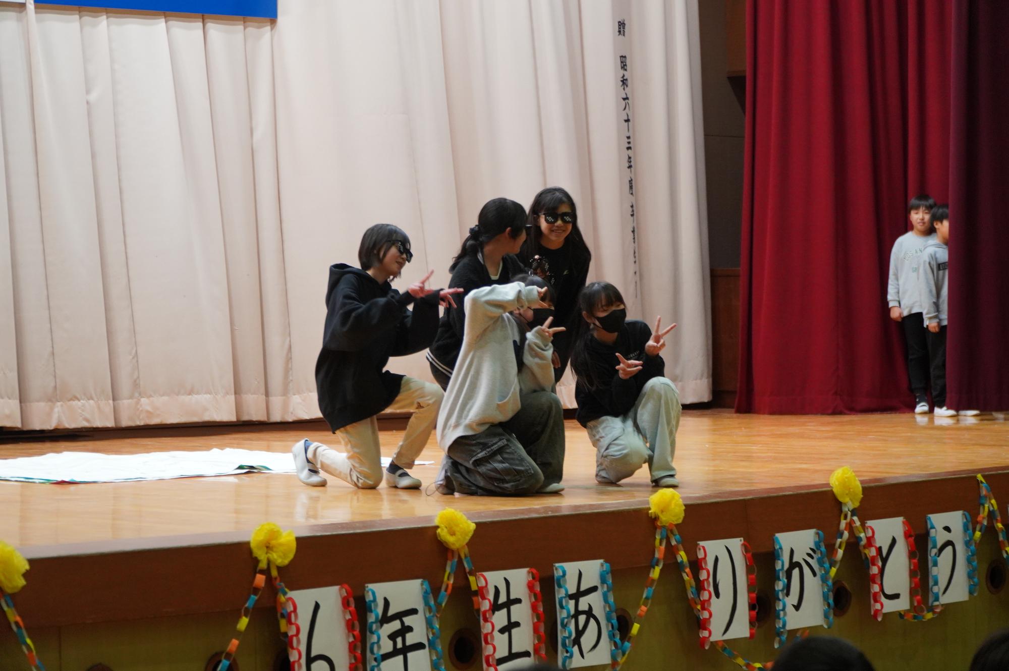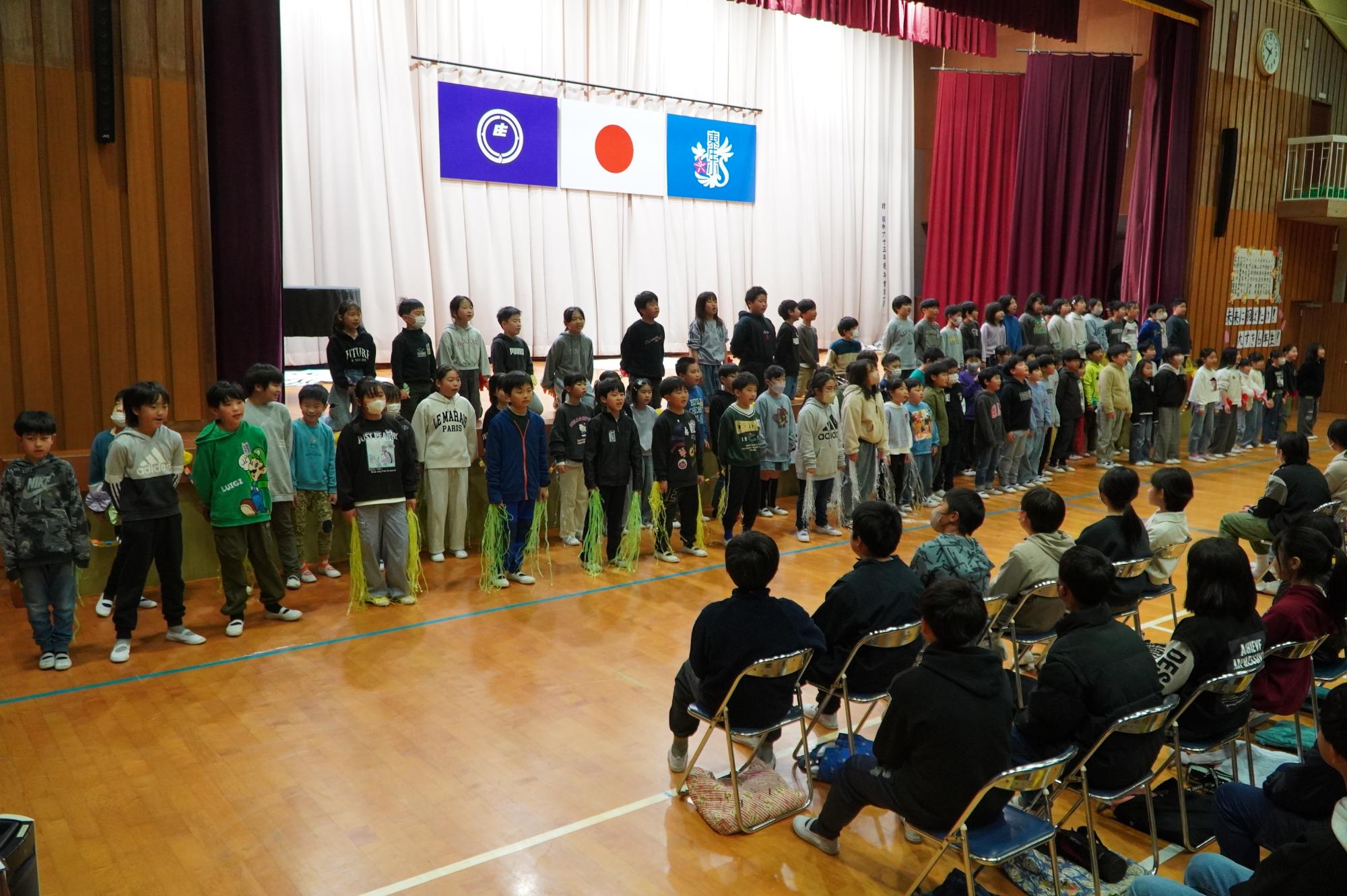 これまで東庄小学校を支えてくれた6年生に感謝と応援の気持ちを込めて、1年生~5年生が歌やダンス、劇などの出し物を発表しました。